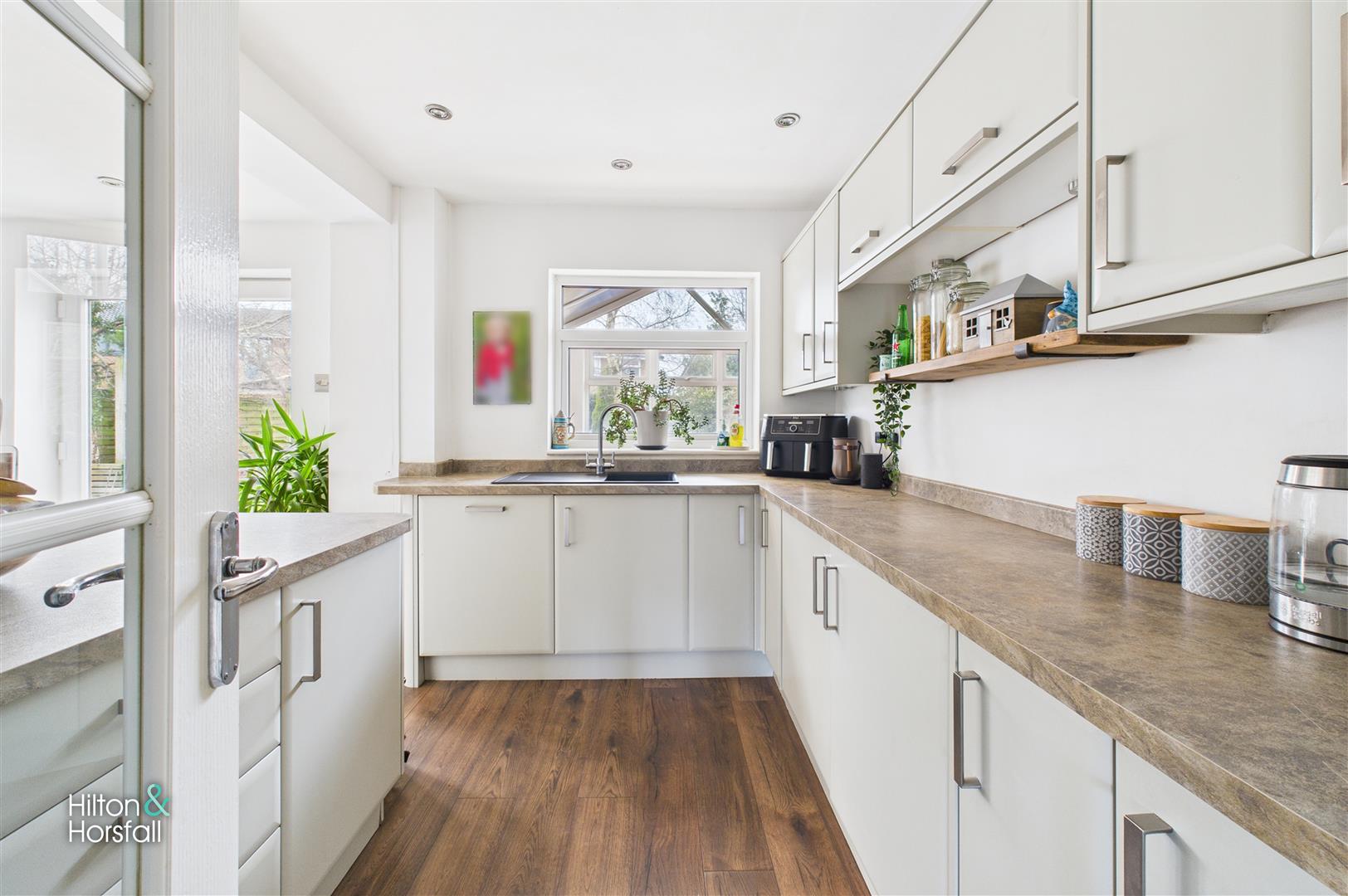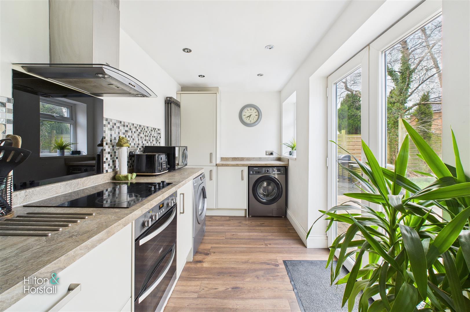 A modern, extended kitchen fitted with a range of neutral wall and base units, contrasting worktops and tiled splashbacks. Enjoys excellent natural light from multiple windows and French doors opening to the rear garden. Includes an integrated oven and hob with extractor, plus ample space for appliances and generous worktop areas ideal for food preparation.