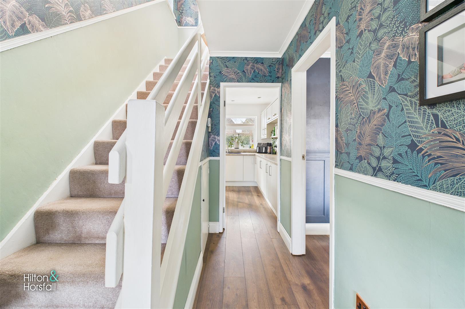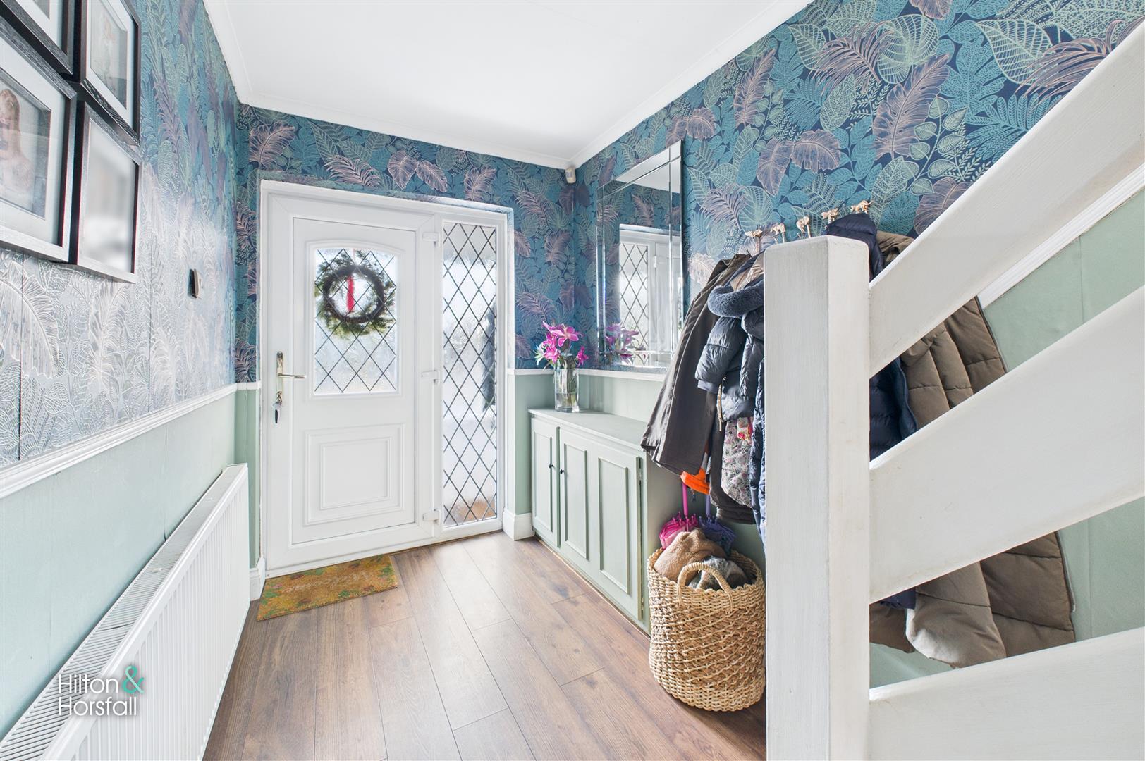A bright and welcoming hallway with wood-effect flooring, half-height dado detailing and stylish patterned décor. Features include a fitted storage unit, coat hooks and a large side window allowing plenty of natural light. Doors lead to the kitchen and living areas, with stairs rising to the first floor.