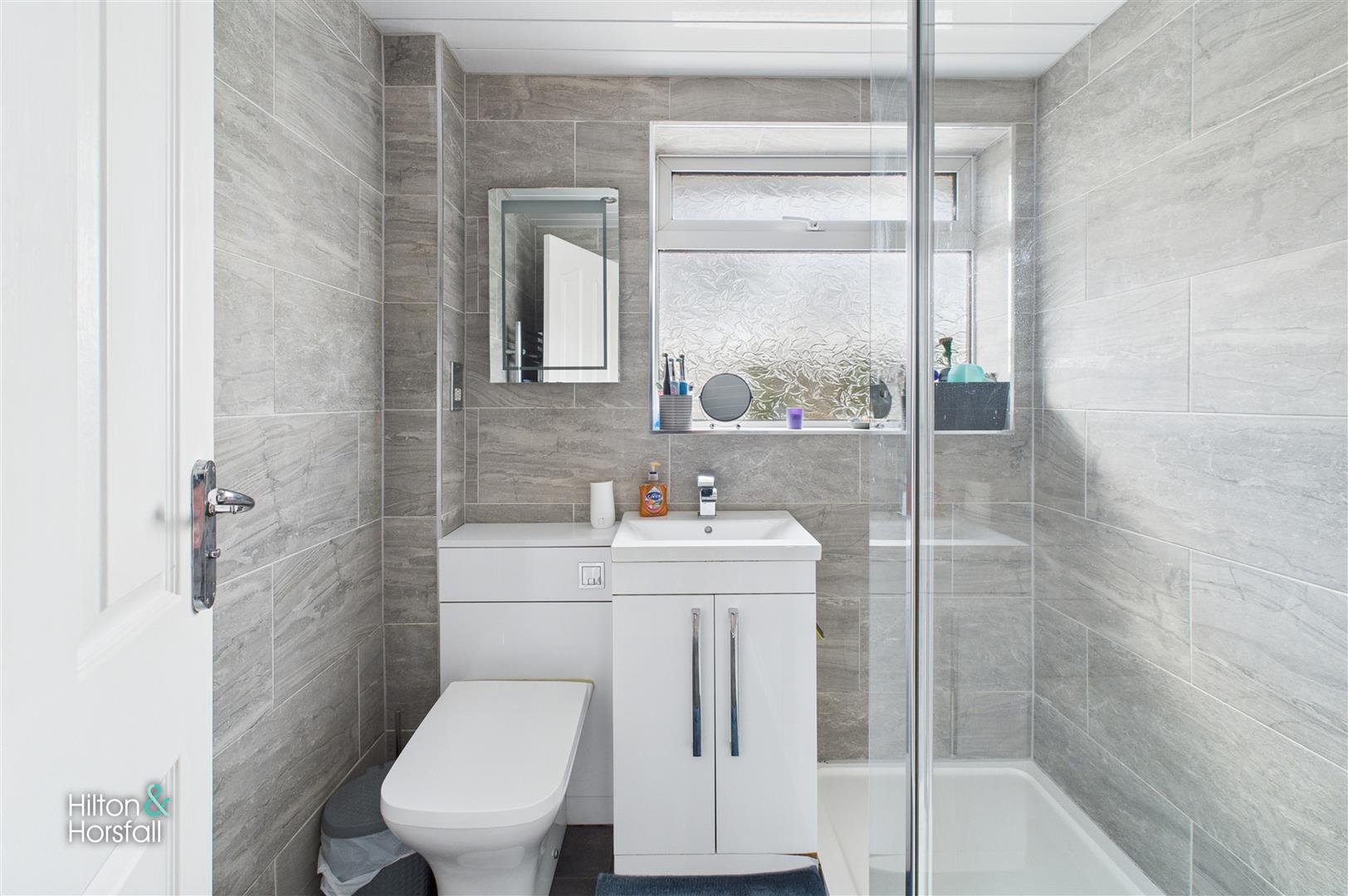 A modern shower room finished with contemporary grey tiling and a walk-in glazed shower enclosure. Includes a vanity unit with inset wash basin, low-level WC and a frosted window providing natural light and privacy.