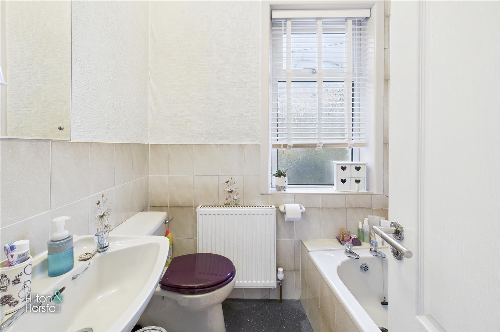 A three-piece bathroom suite comprising a panelled bath with shower attachment, pedestal wash basin, and low-level WC. The room is partially tiled for ease of maintenance and includes a uPVC double glazed frosted window to the rear elevation providing natural light and privacy. Finished with neutral tones and a central heating radiator, this bathroom offers a clean and practical space.