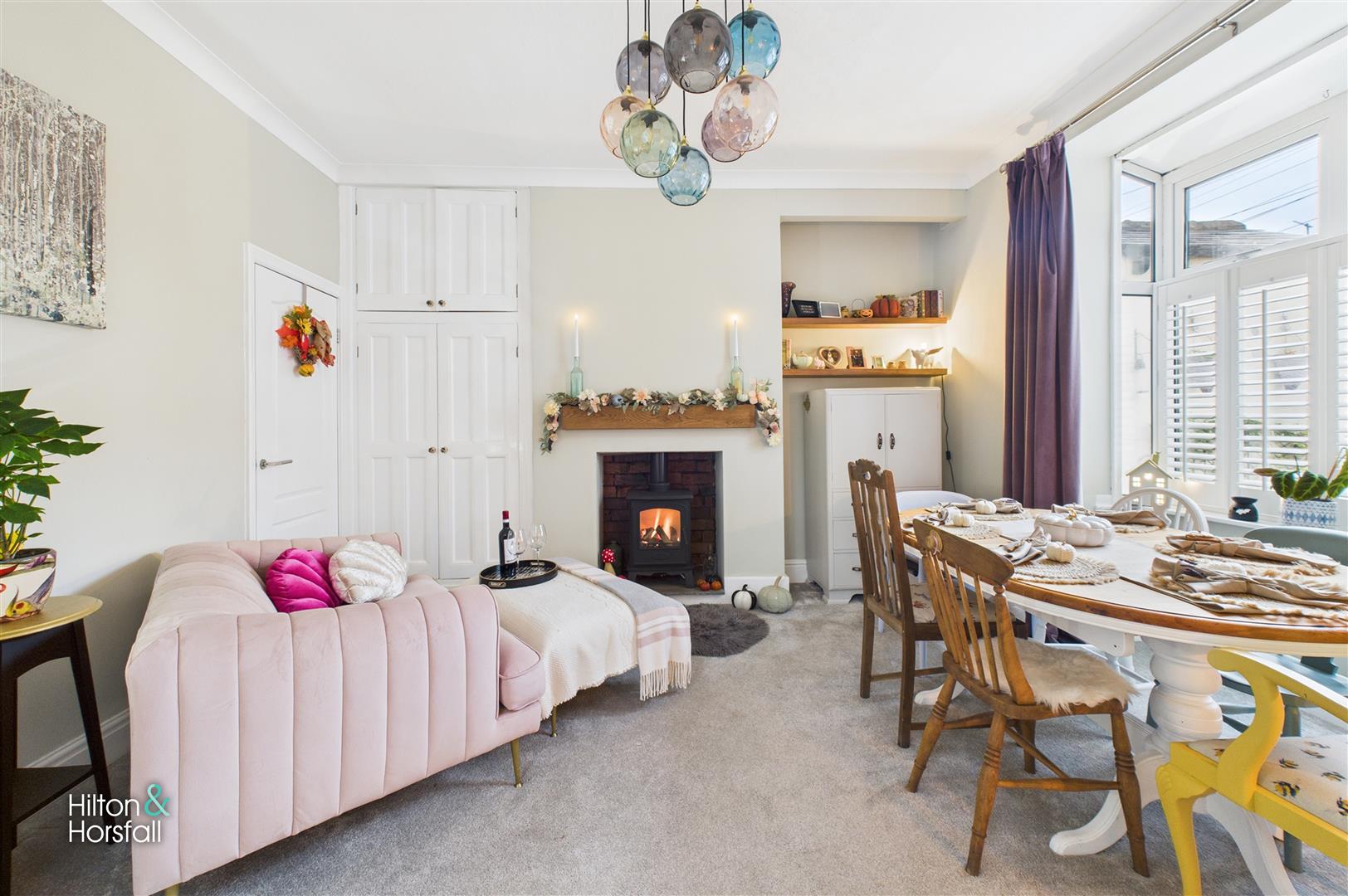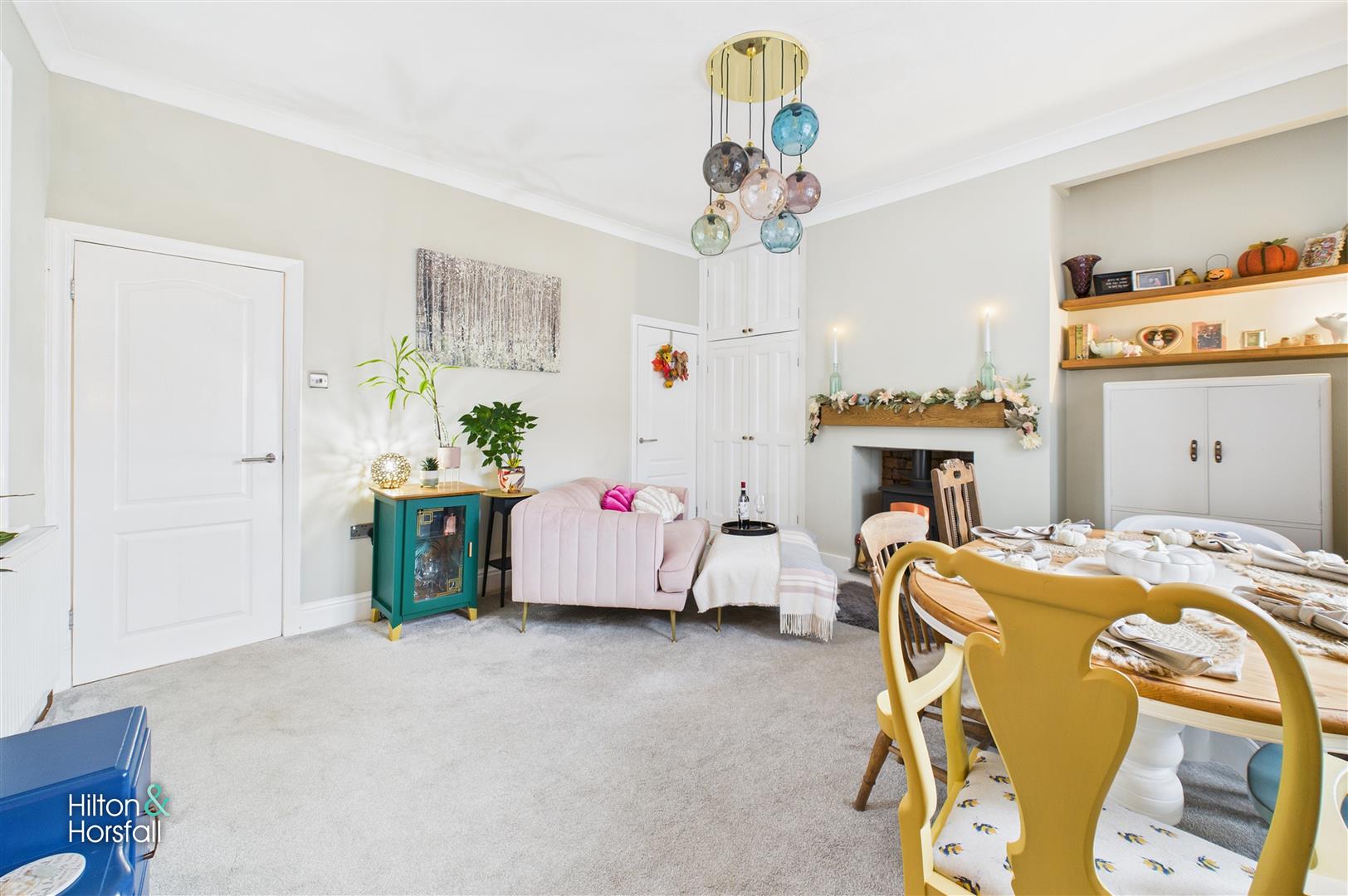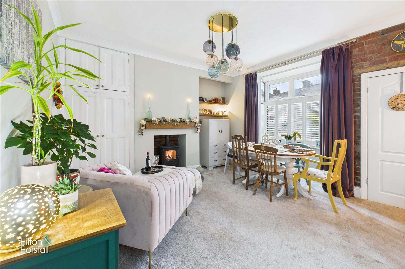 A generous and tastefully decorated second reception room located to the rear of the property. This delightful space offers a perfect blend of comfort and style, featuring a cosy log-burning stove set within a brick chimney breast with a timber mantel above. The room is finished in soft, neutral tones complemented by a modern light fitting and plush carpeting, creating a welcoming atmosphere. A large uPVC double glazed window overlooks the rear elevation, filling the room with natural light. This versatile space provides ample room for both relaxation and dining, making it ideal for family living or entertaining guests.