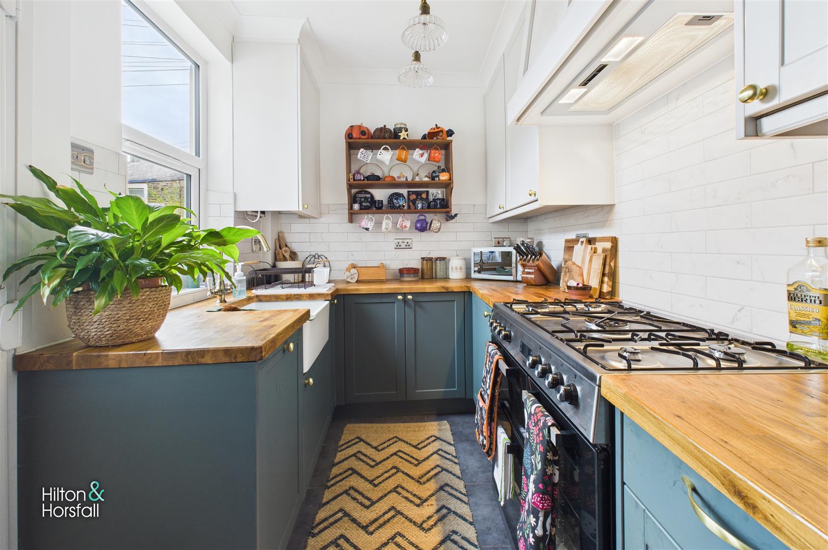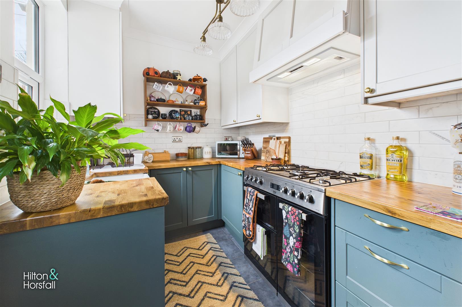 A recently installed, stylish kitchen fitted with an attractive range of shaker-style wall, base and drawer units with contrasting wooden work surfaces and tiled splashbacks. The design blends classic charm with modern functionality, featuring two-tone cabinetry with brass fittings, an inset ceramic Belfast sink, and ample worktop space for meal preparation. There is space for a range-style cooker with extractor over, plumbing for appliances, and a uPVC double glazed window overlooking the rear courtyard which allows plenty of natural light. A uPVC door provides access to the rear yard, creating a seamless connection between the indoor and outdoor spaces. This kitchen offers a practical and beautifully finished setting that perfectly complements the home’s character.