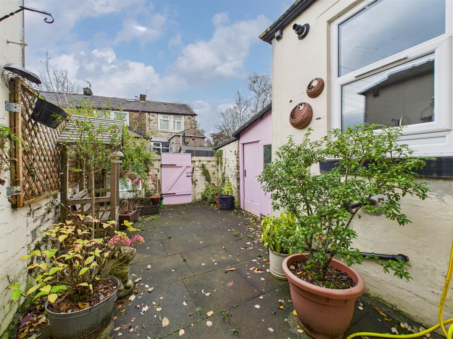 To the rear of the property is a charming, low-maintenance courtyard finished with paved flooring and bordered by stone walls. The space includes a useful outbuilding for storage and is ideal for potted plants or outdoor seating. A gated access point leads to the rear lane, providing added convenience. This private outdoor area offers a pleasant space to relax and enjoy the warmer months.
