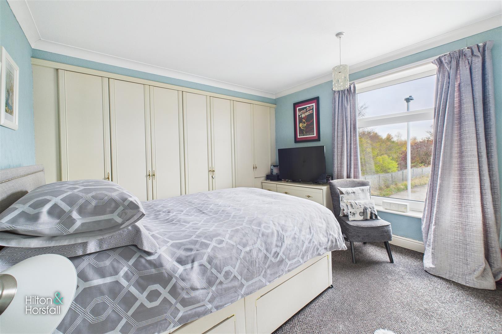A spacious double bedroom positioned to the front elevation, offering a bright and airy feel. The room benefits from a large uPVC double glazed window allowing plenty of natural light to flood in. Fitted with a full range of built-in wardrobes providing excellent storage space, the room is tastefully decorated in soft, calming tones and finished with quality carpeting underfoot. This is a comfortable and well-presented main bedroom, ideal for relaxation.