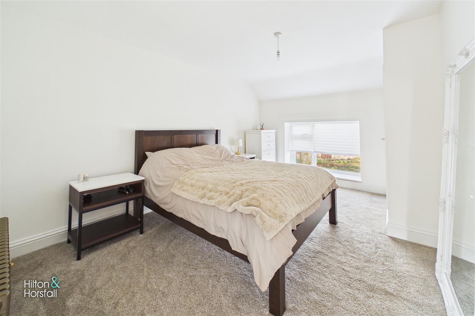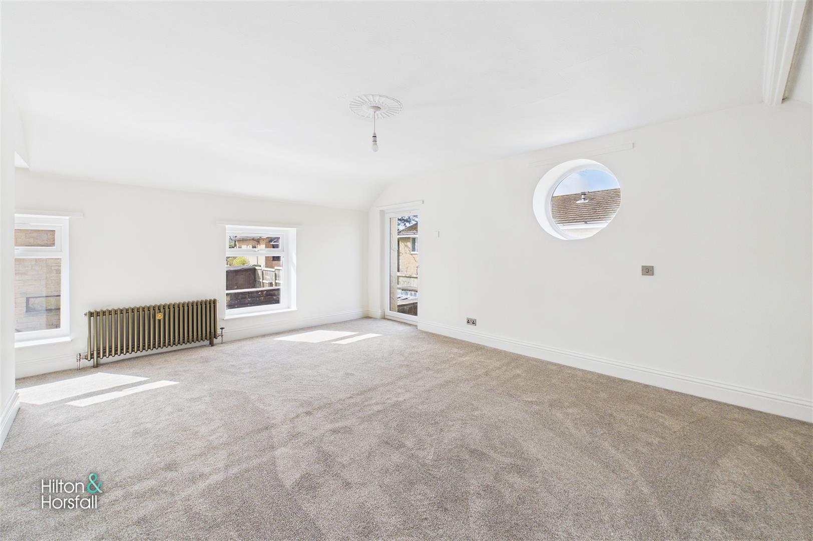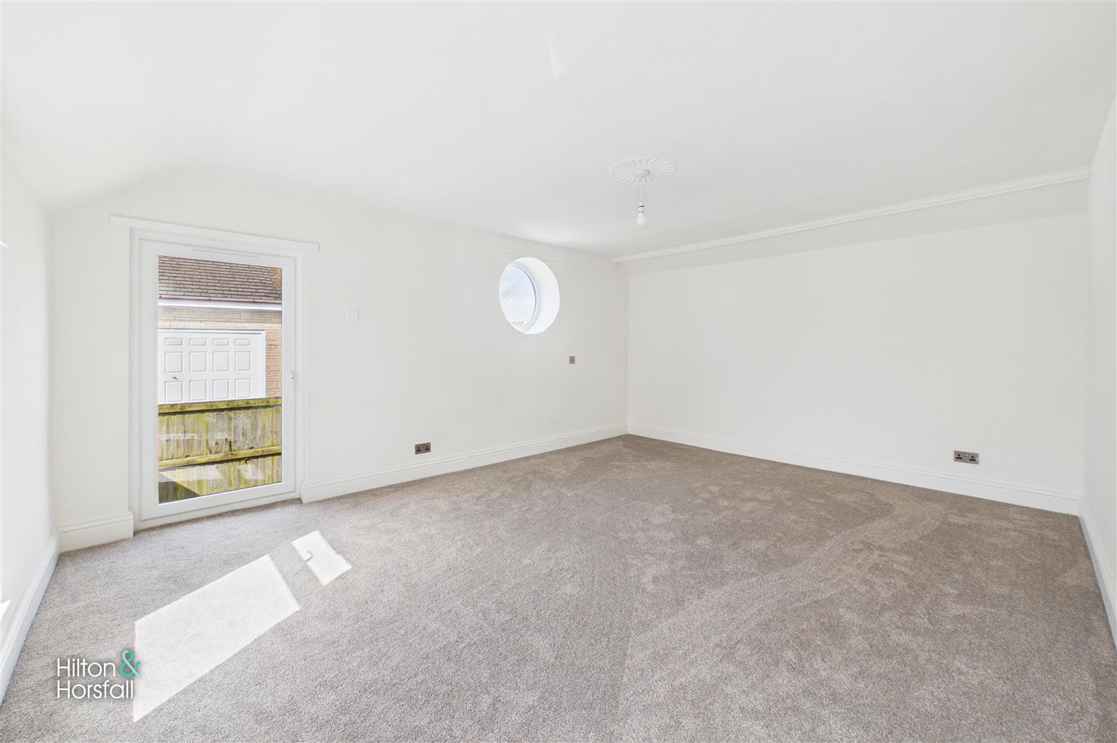 A generous double bedroom offering ample space for furnishings, beautifully presented with neutral décor and fitted carpet. The room benefits from multiple windows allowing for plenty of natural light, along with a unique circular feature window adding character. A bright and spacious principal bedroom.