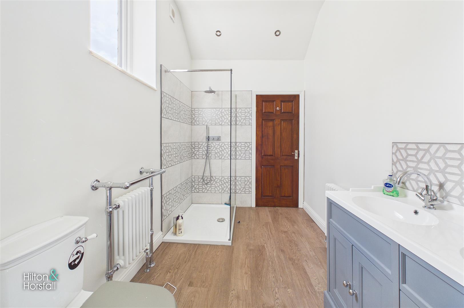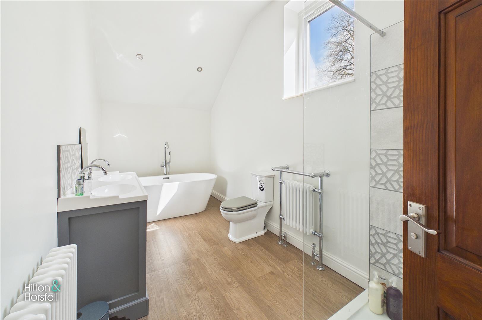 A stylish and spacious four-piece bathroom suite comprising a freestanding bath, walk-in shower with glass screen, low level WC and a double wash hand basin set within a vanity unit. The room is finished with contemporary fittings, complementary tiling and flooring, along with a window allowing for natural light. A beautifully presented and well-appointed family bathroom.