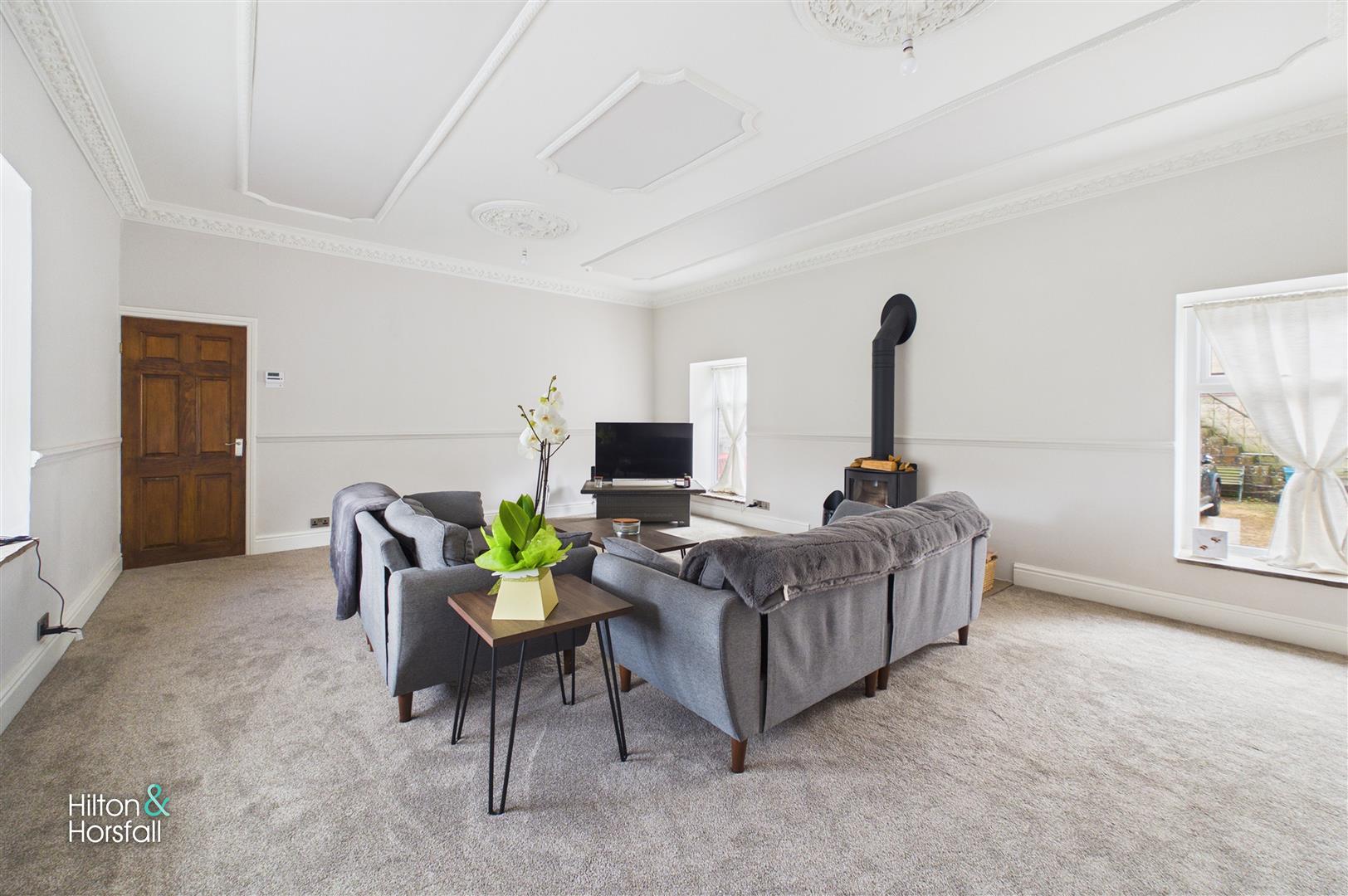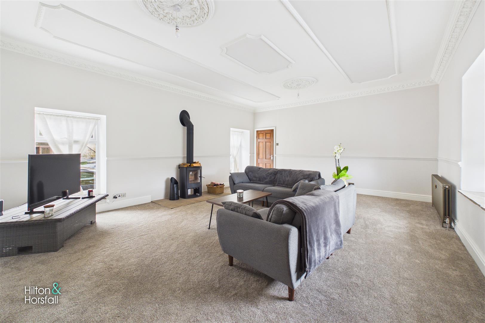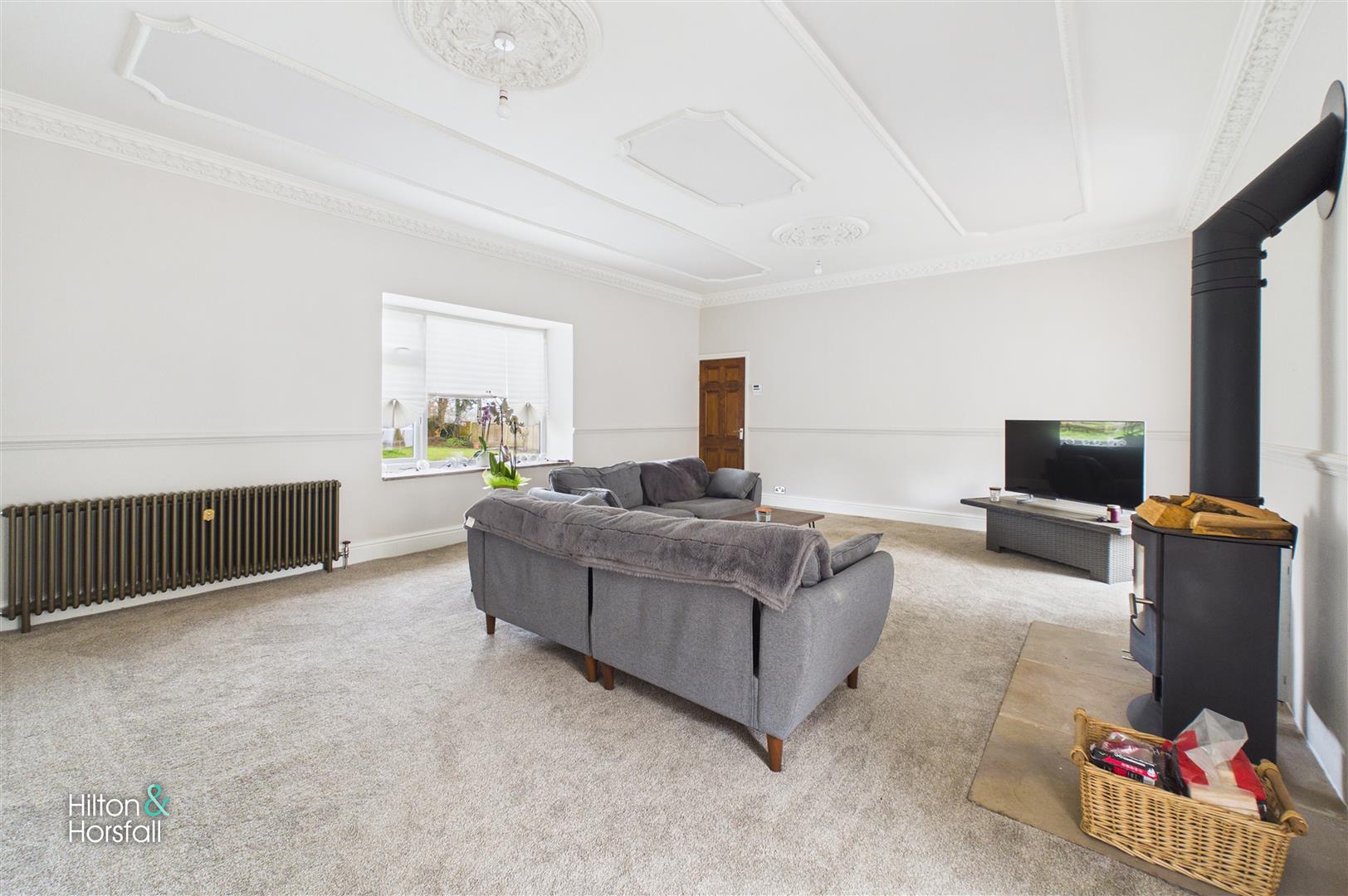 A stunning and generously proportioned living room featuring high ceilings with ornate coving and ceiling details, creating a real sense of character and space. The room is beautifully presented and benefits from windows to both the front and rear, allowing for an abundance of natural light throughout. A log burning stove set on a stone hearth provides a focal point to the room, making it a warm and inviting space ideal for relaxing or entertaining.