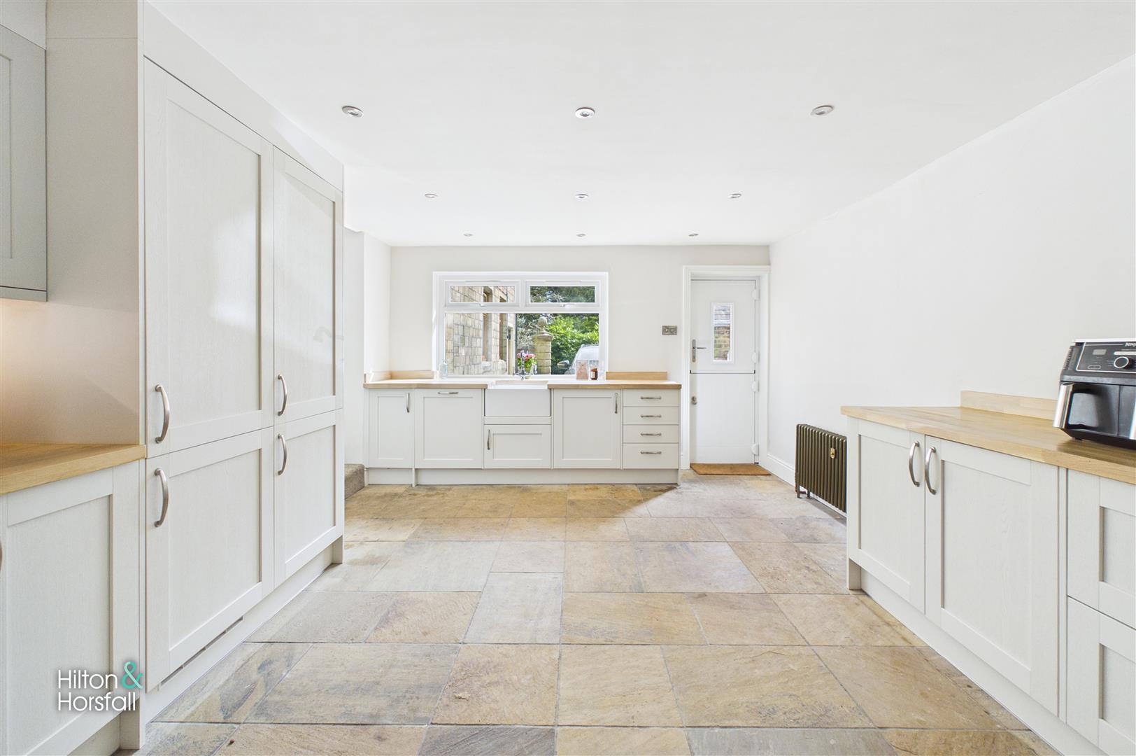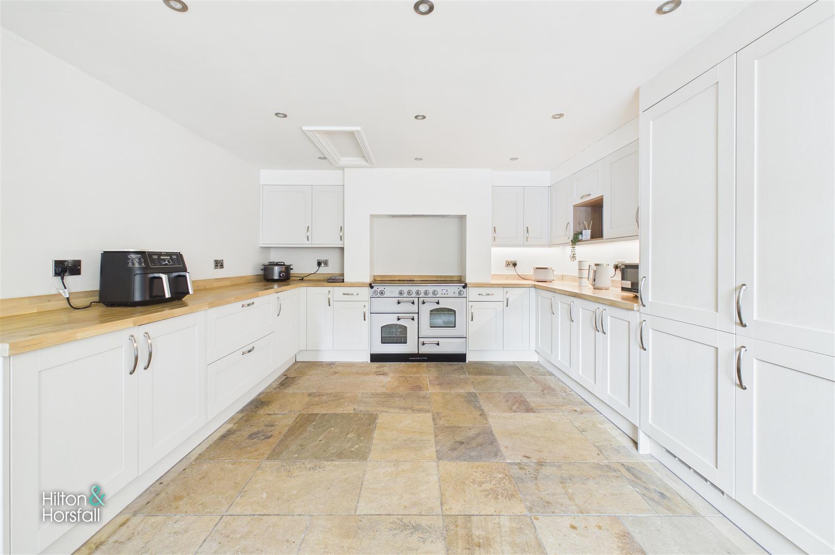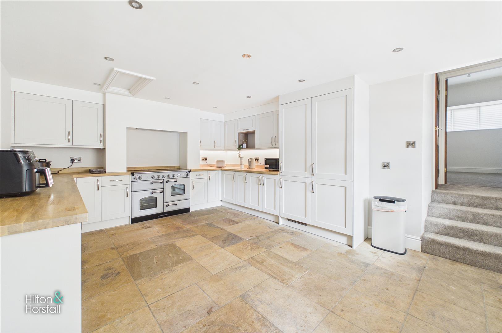A spacious and beautifully presented fitted kitchen comprising a range of matching wall and base units with contrasting work surfaces, incorporating a range-style cooker set within a recessed chimney breast. The room benefits from quality tiled flooring, recessed spot lighting and ample space for dining, making it ideal for both everyday family living and entertaining. There is a door providing access out to the front courtyard, along with internal access to the rest of the property.
