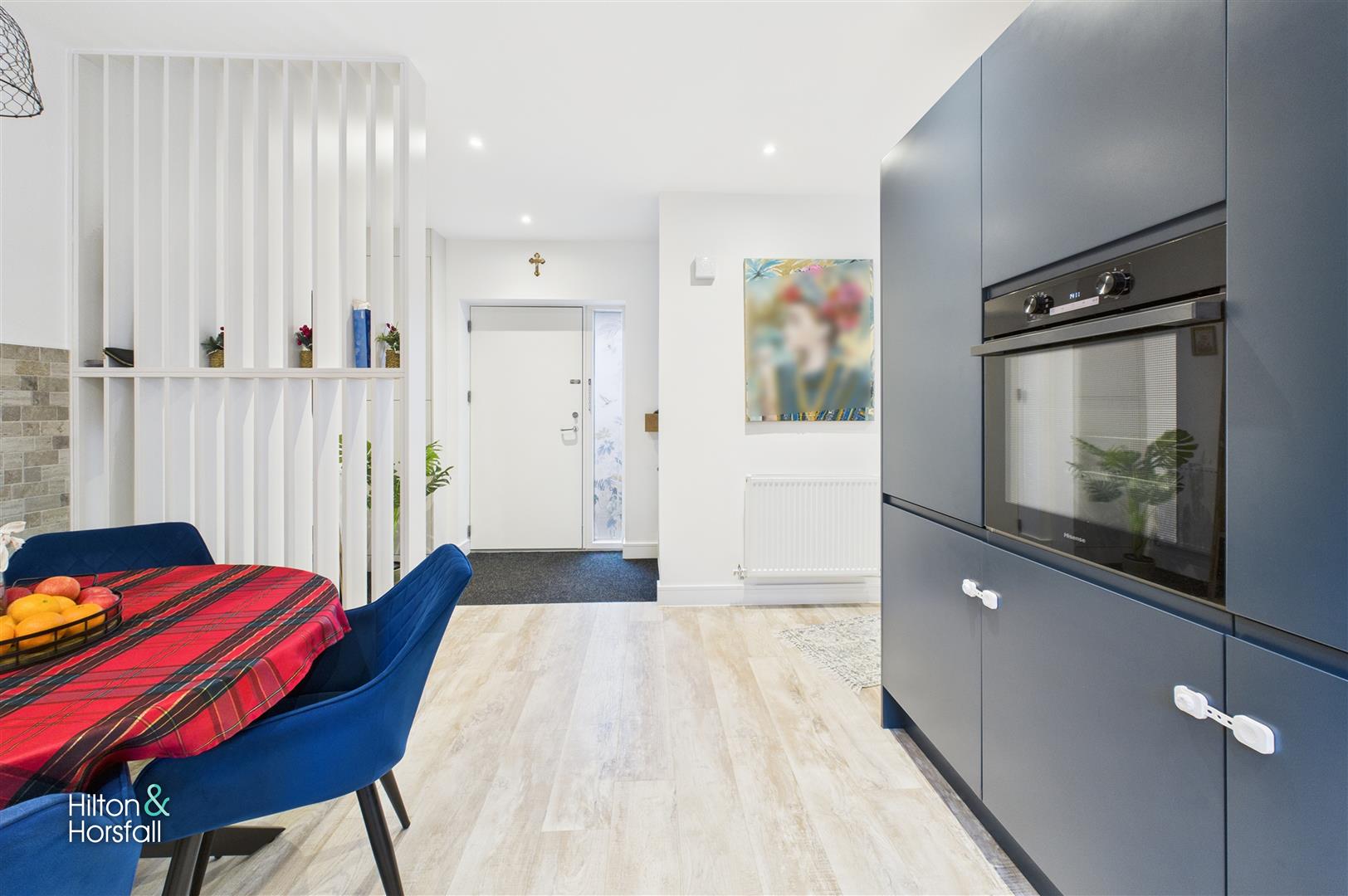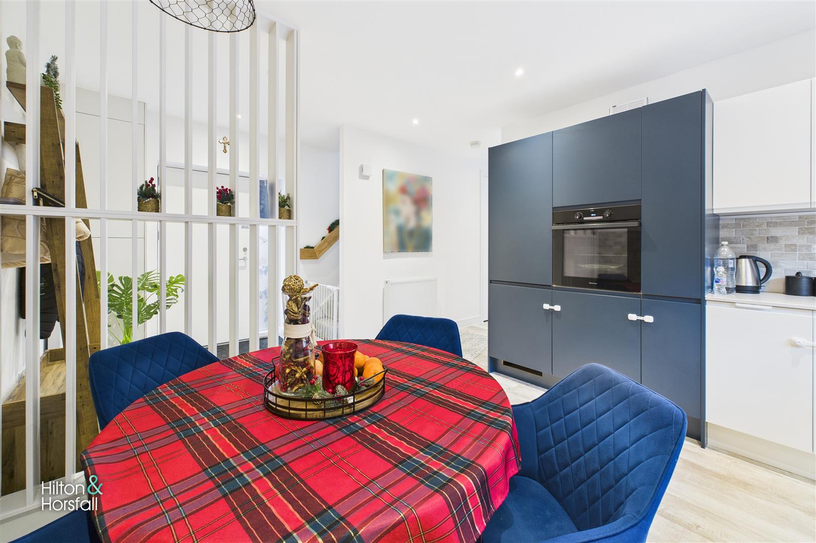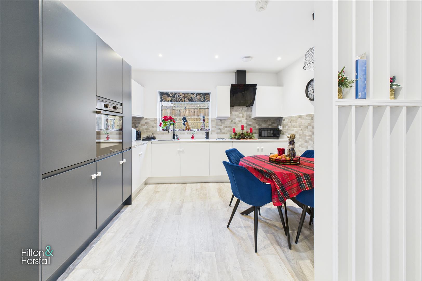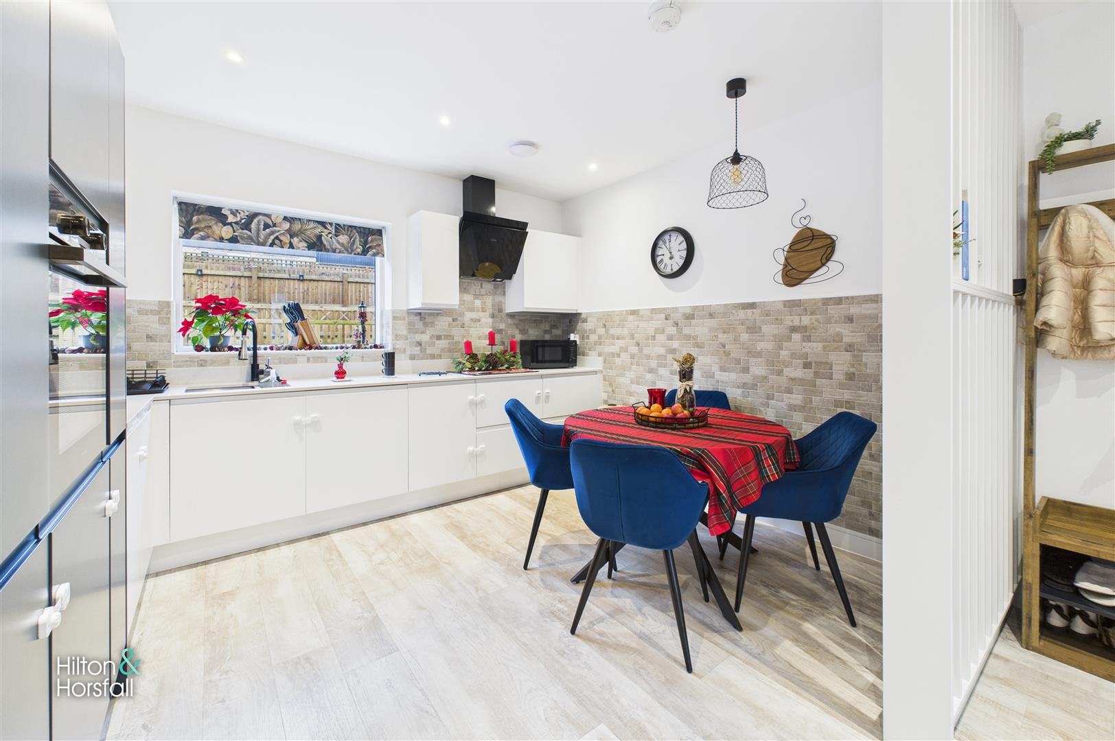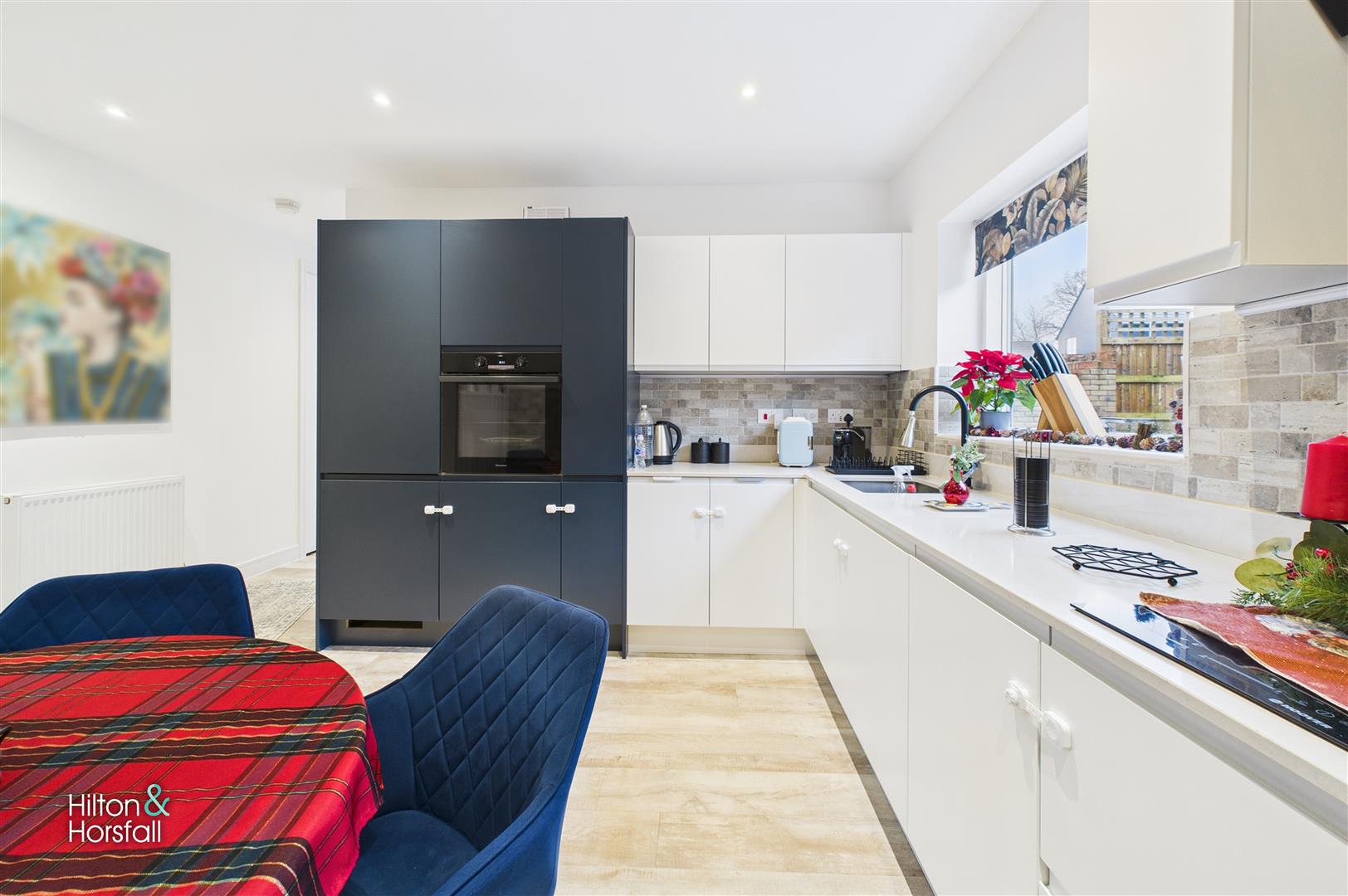 A stylish and well-appointed dining kitchen fitted with a modern range of wall and base units complemented by integrated appliances and generous worktop space. The layout provides ample room for a dining table, creating a practical and sociable hub for everyday living. Finished with contemporary flooring, tiled splashbacks and recessed ceiling lighting, the space is further enhanced by a rear window overlooking the garden, delivering excellent natural light.