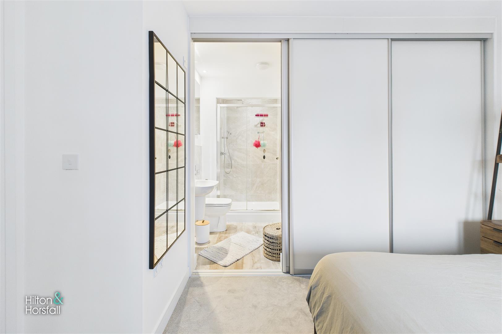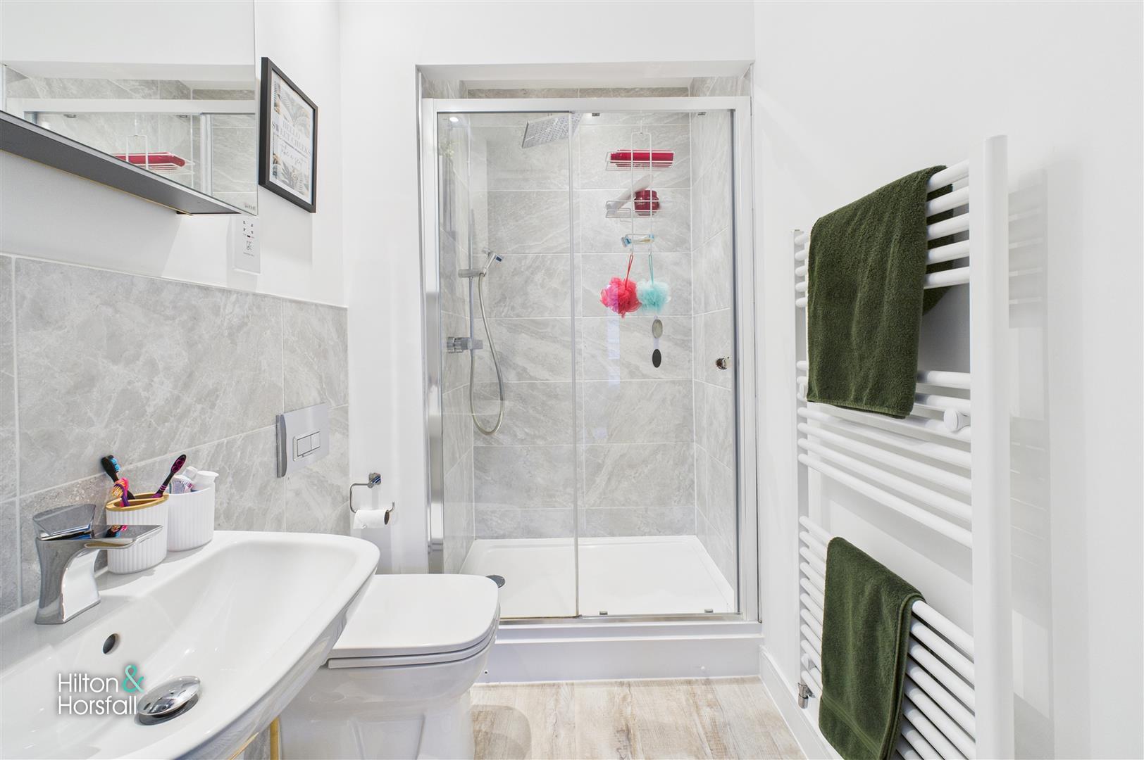 A contemporary en-suite shower room fitted with a modern three-piece suite, including a walk-in shower enclosure, wash basin and WC. Finished with stylish tiling and a heated towel radiator, the space offers a clean and practical design to complement the principal bedroom.