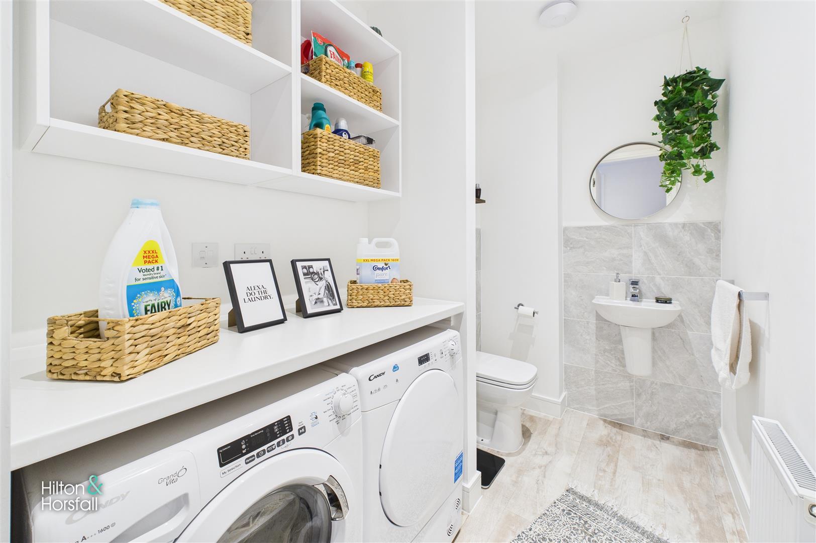 A practical and well-designed utility room incorporating fitted shelving, worktop space and plumbing for appliances, providing excellent additional storage. The room also houses a modern two-piece cloakroom suite, making it ideal for everyday family use and guests alike.