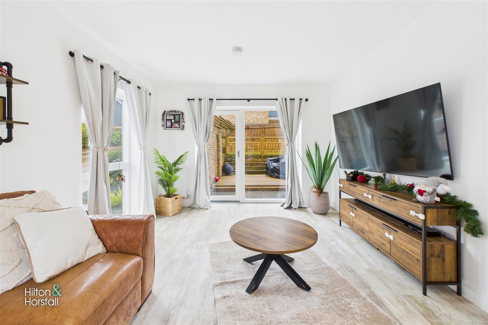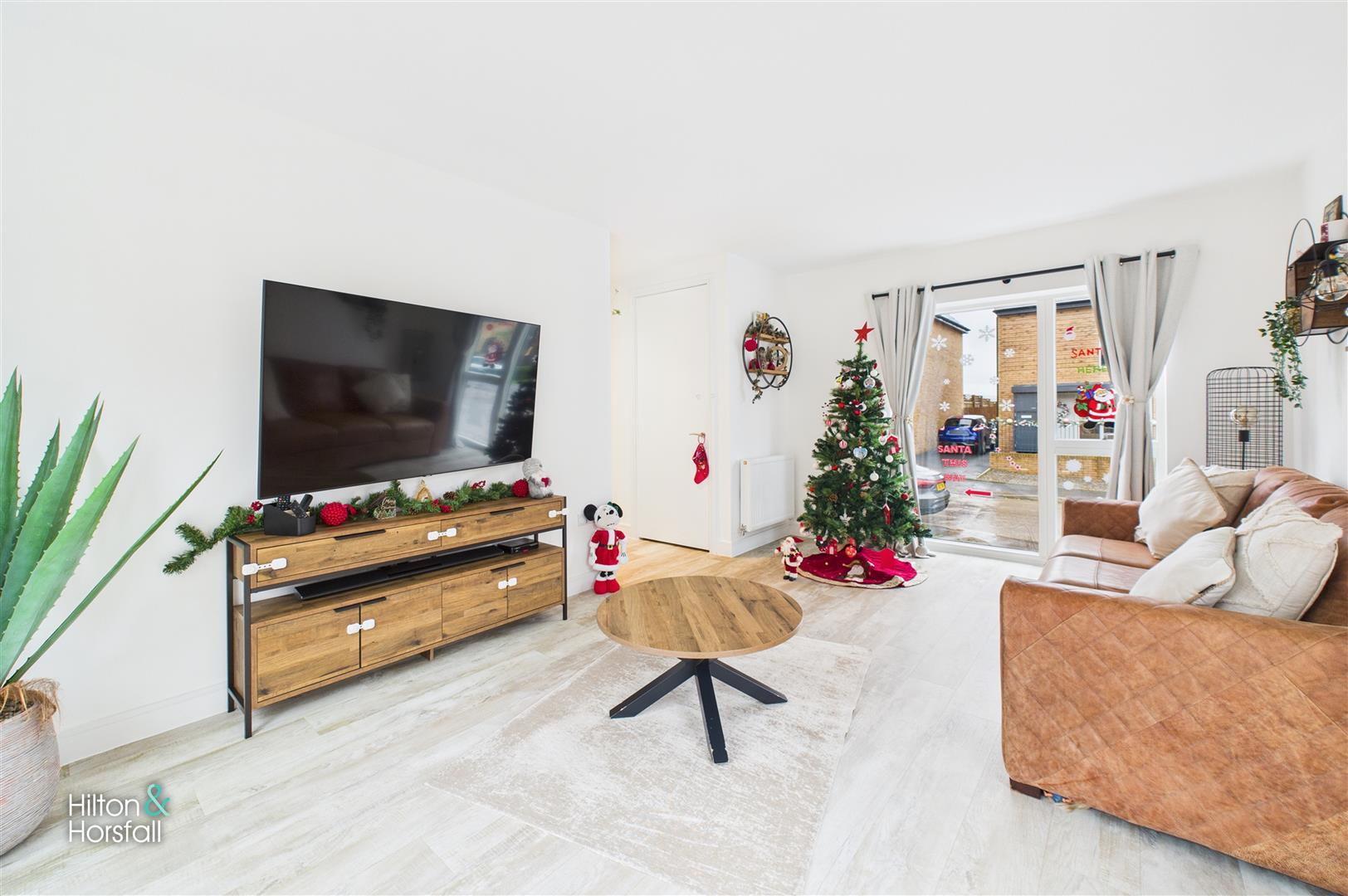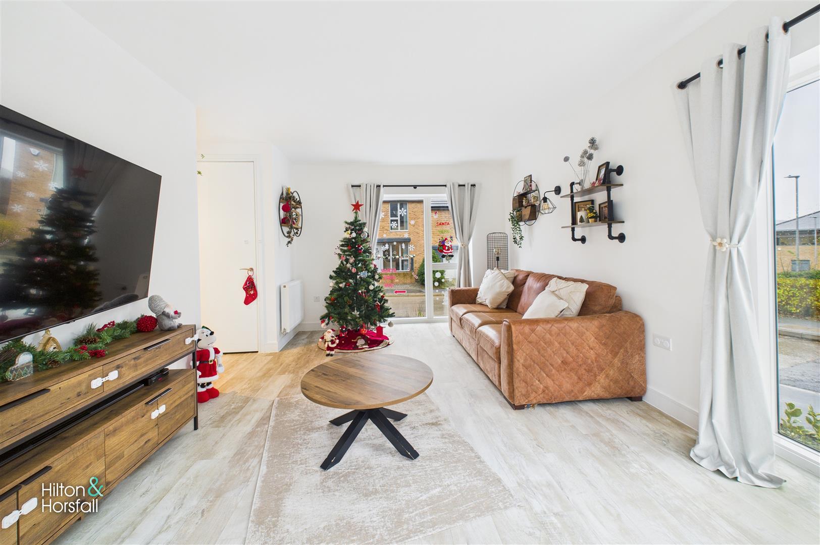 A bright and well-proportioned living room positioned to the front of the property, enjoying excellent natural light via full-height windows. Finished with modern flooring and neutral décor, the space offers a comfortable and welcoming setting for everyday living, with ample room for a range of furniture layouts. A contemporary yet cosy room, perfectly suited to relaxing or entertaining.
