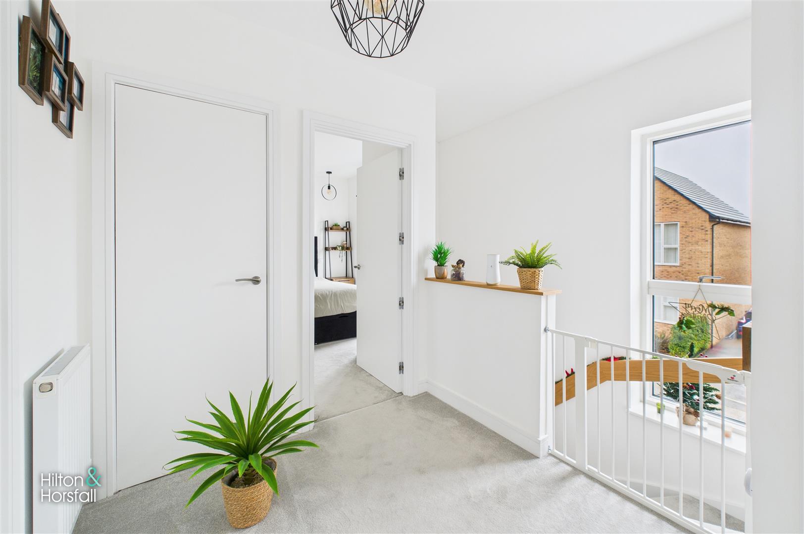 A bright and spacious first-floor landing providing access to all three bedrooms, the bathroom and shower room. Finished with neutral décor and soft carpeting, the area benefits from natural light and includes space suitable for occasional furniture or decorative features, creating a pleasant and airy feel.