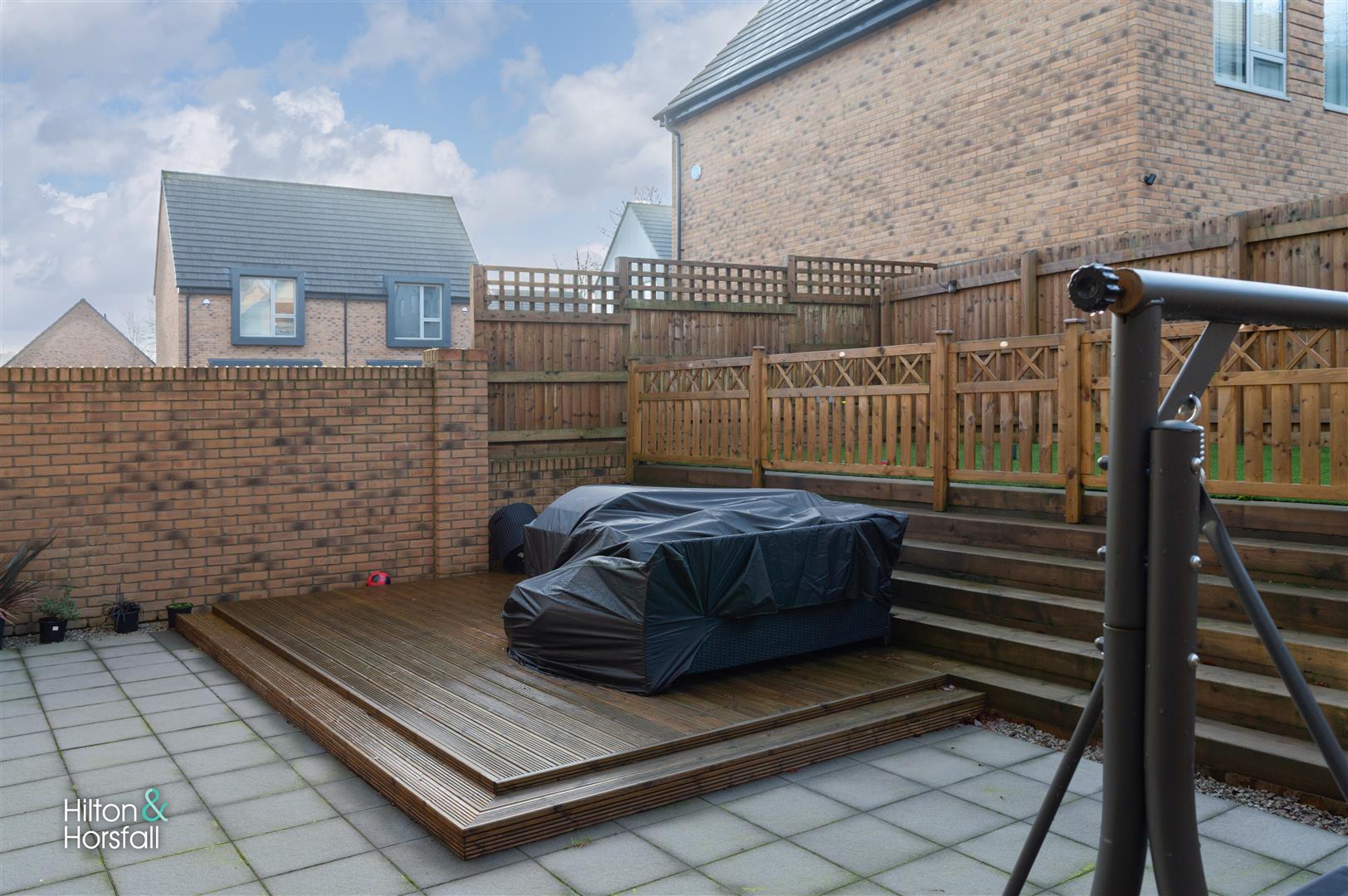 To the rear of the property is a low-maintenance enclosed garden, arranged with a paved patio area and an elevated decked seating space, ideal for outdoor dining and entertaining. To the front and side, the property benefits from a private driveway providing off-road parking, completing the external offering of this modern detached home.