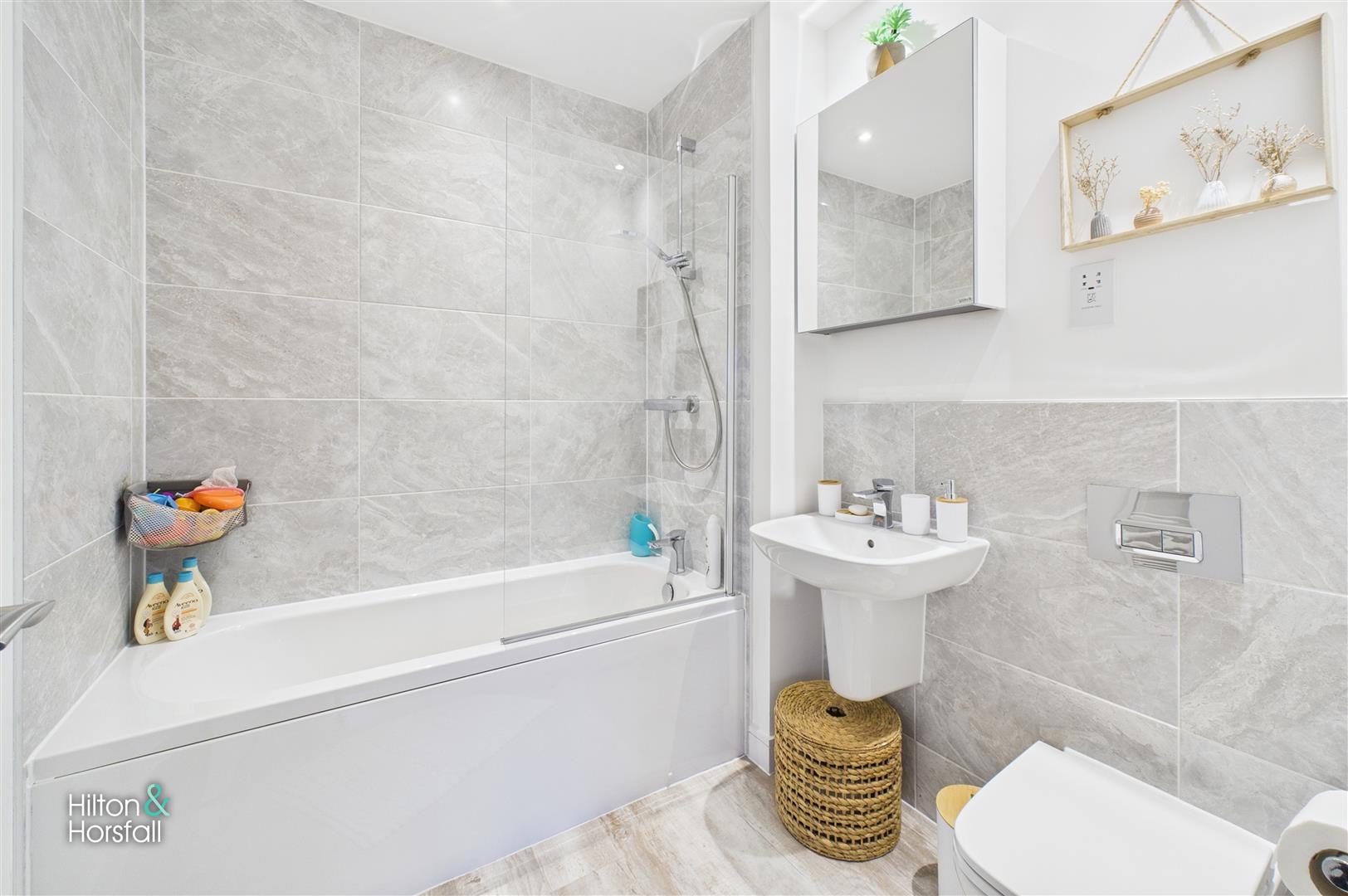 A modern family bathroom fitted with a contemporary three-piece suite comprising a panelled bath with shower over, wash basin and WC. Finished with stylish tiling and complementary fittings, the room offers a clean and practical space for everyday family use.
