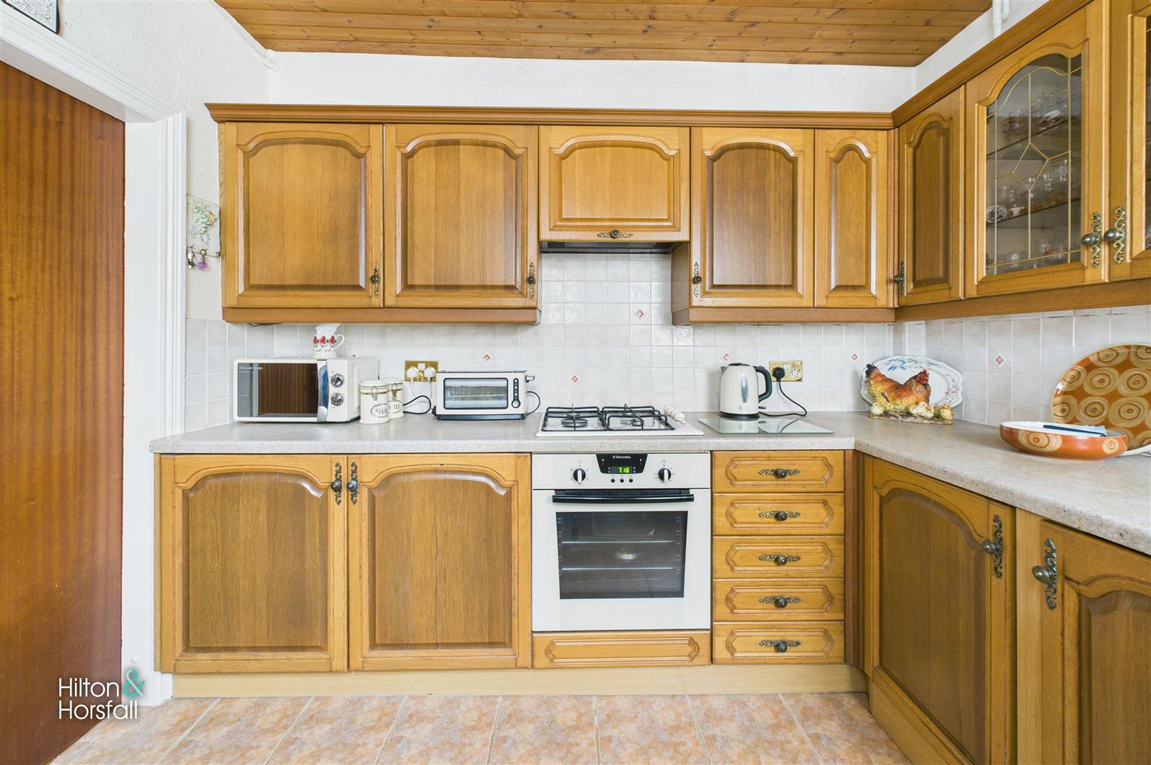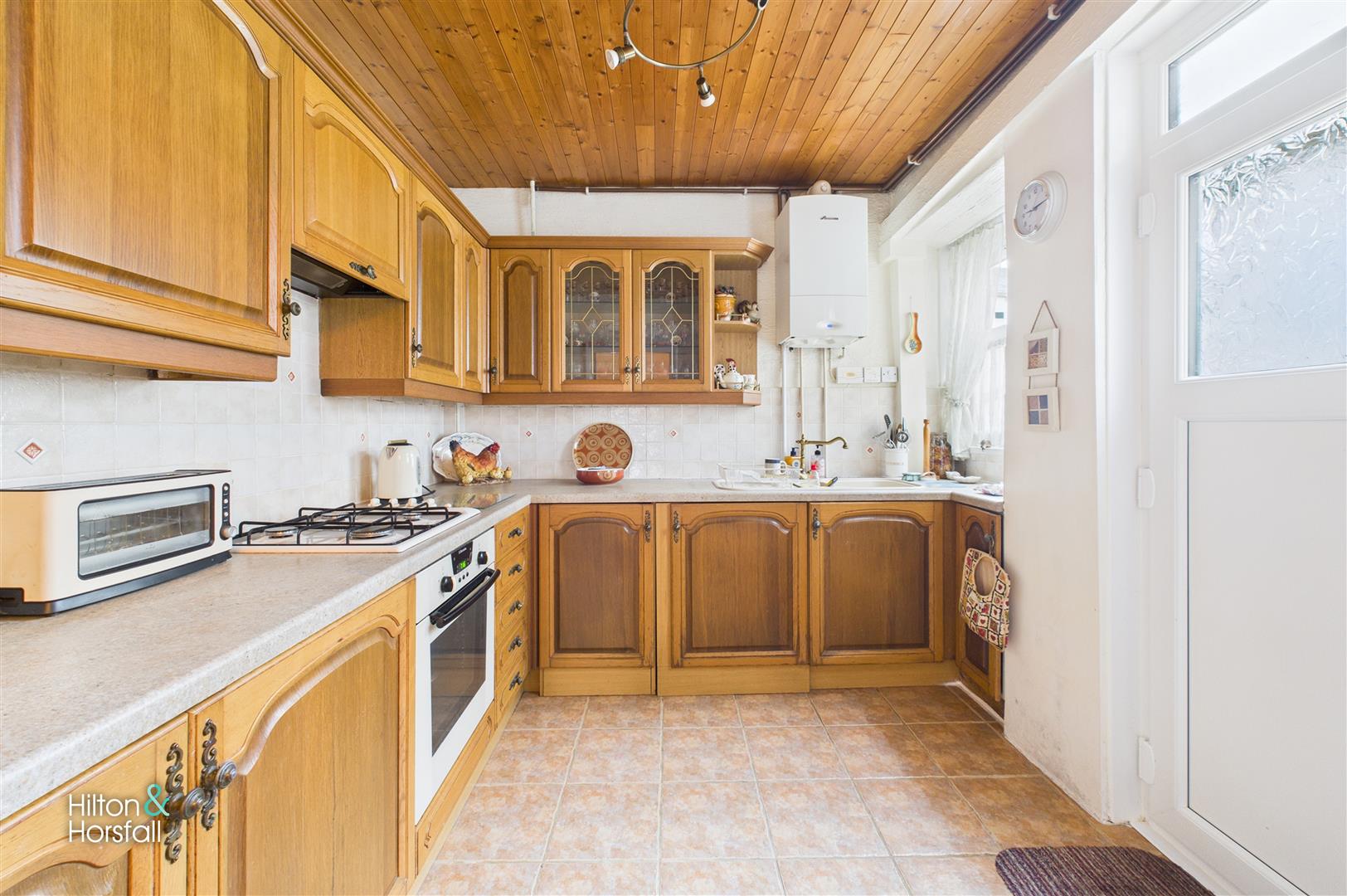 A fitted kitchen positioned to the rear of the property, comprising a range of wall and base units with complementary work surfaces and tiled splashbacks. The kitchen incorporates an integrated oven, gas hob with extractor over, and space for additional appliances. A door provides direct access to the rear yard, making this a practical and functional space for everyday use.