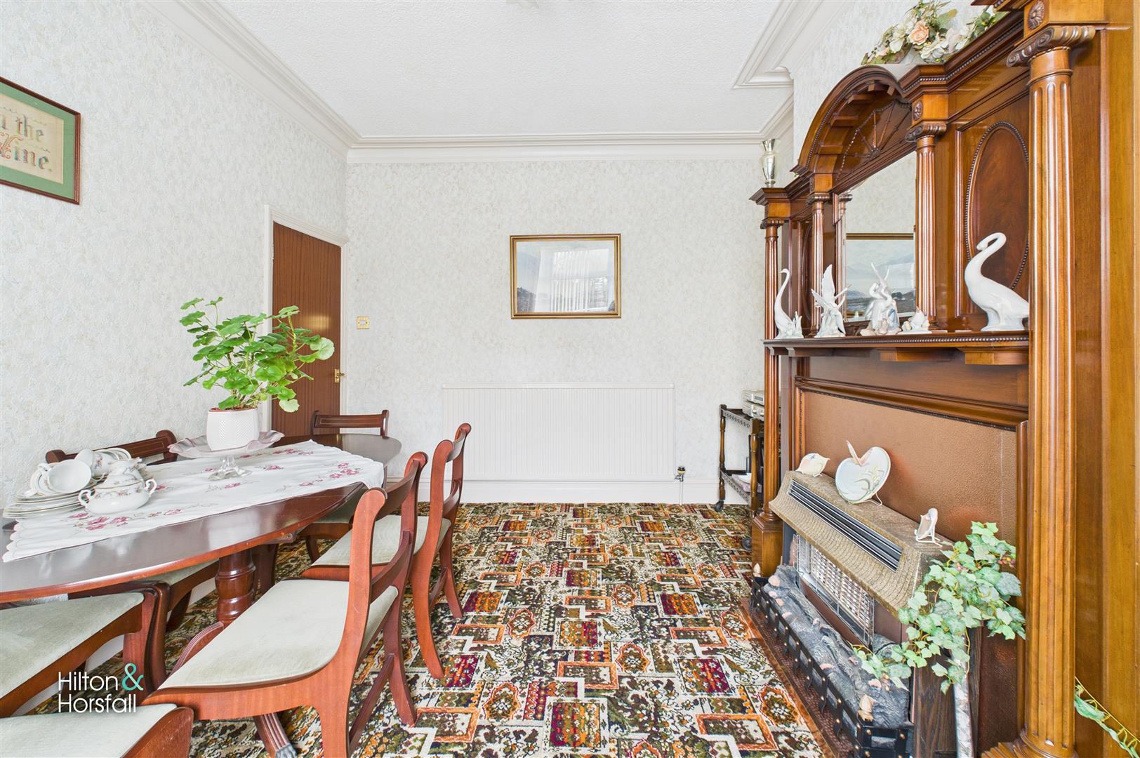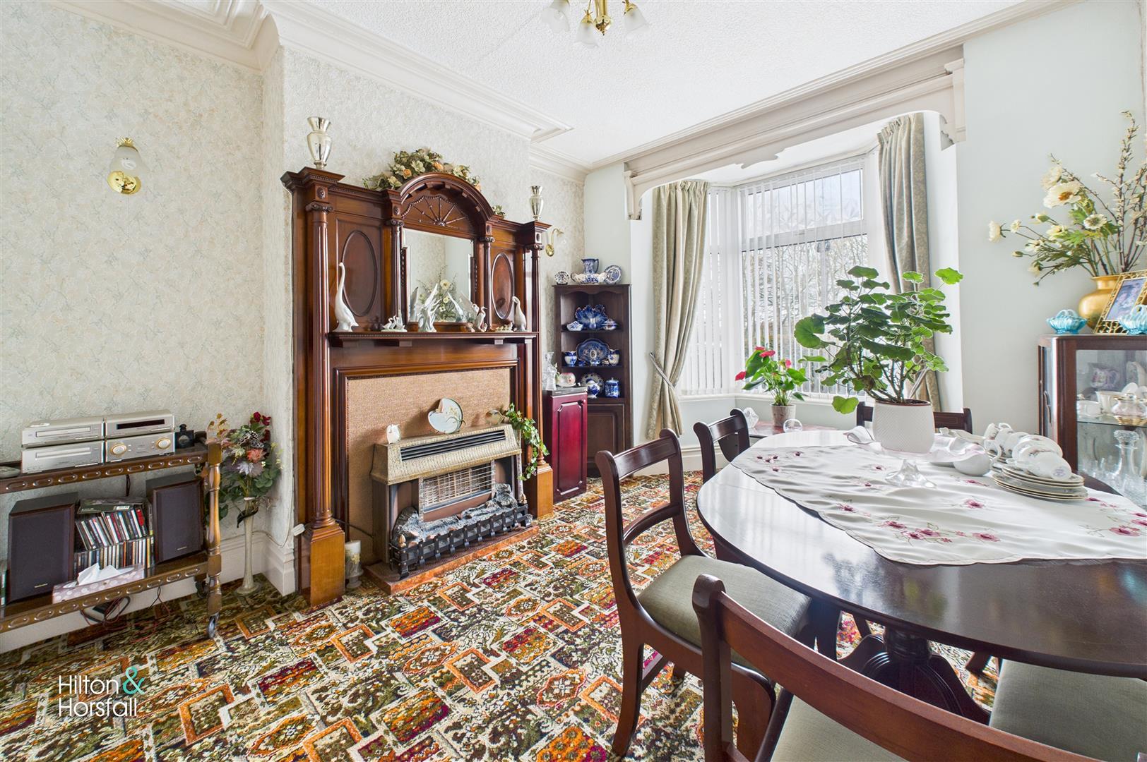 A spacious bay-fronted sitting room positioned to the front elevation, enjoying excellent natural light. The room features decorative coving, a traditional fireplace with ornate surround and hearth, and provides ample space for both seating and a dining table if desired. A pleasant, welcoming room that works well as a formal sitting or dining area.