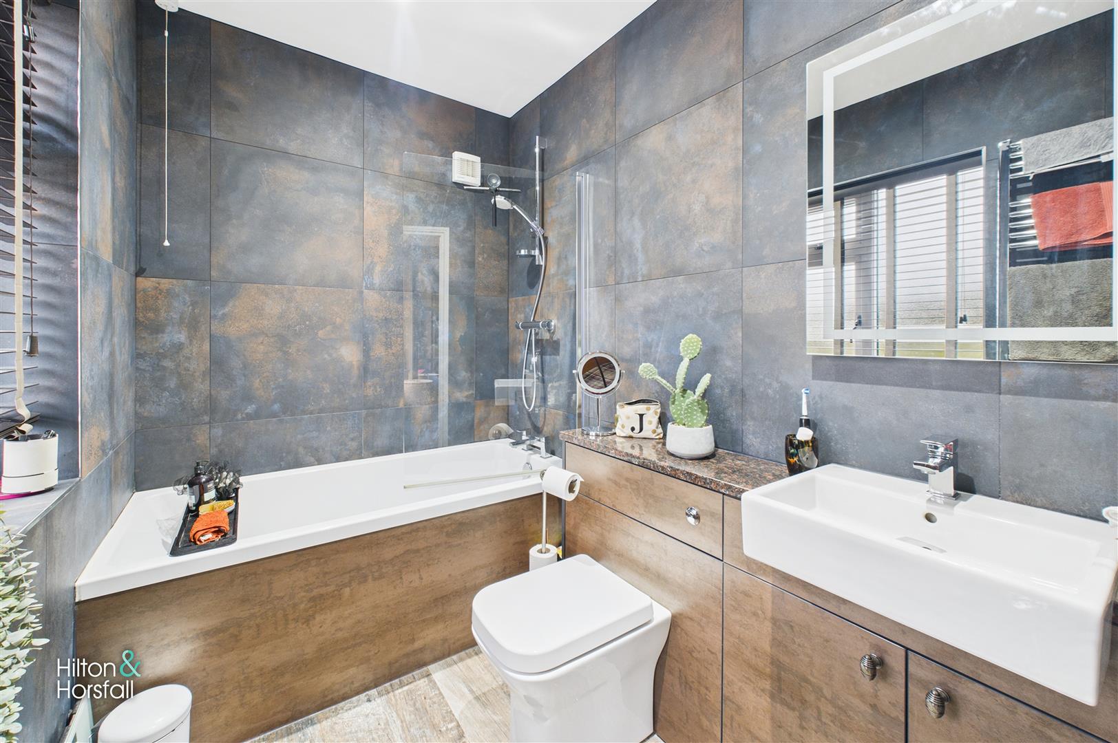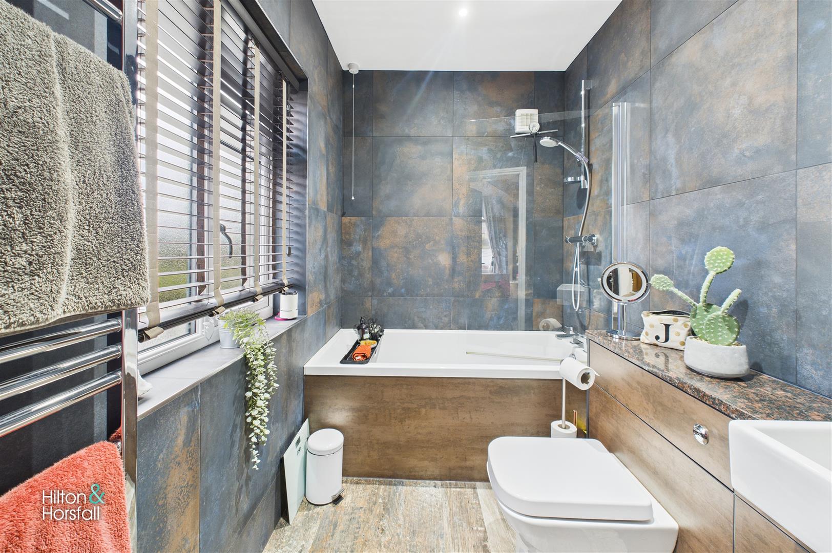 The stylish en-suite is finished to a high standard, featuring contemporary floor-to-ceiling tiling, a panelled bath with overhead shower and glass screen, a wash basin set within fitted cabinetry, and a low-level WC. A heated towel rail and a frosted window complete this modern, well-appointed space.