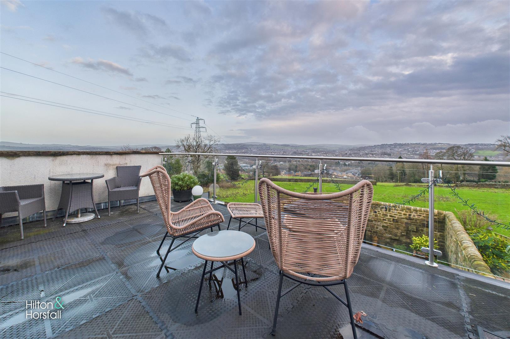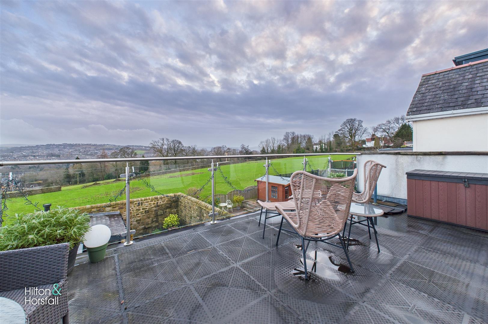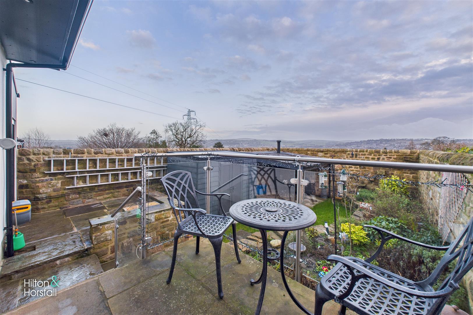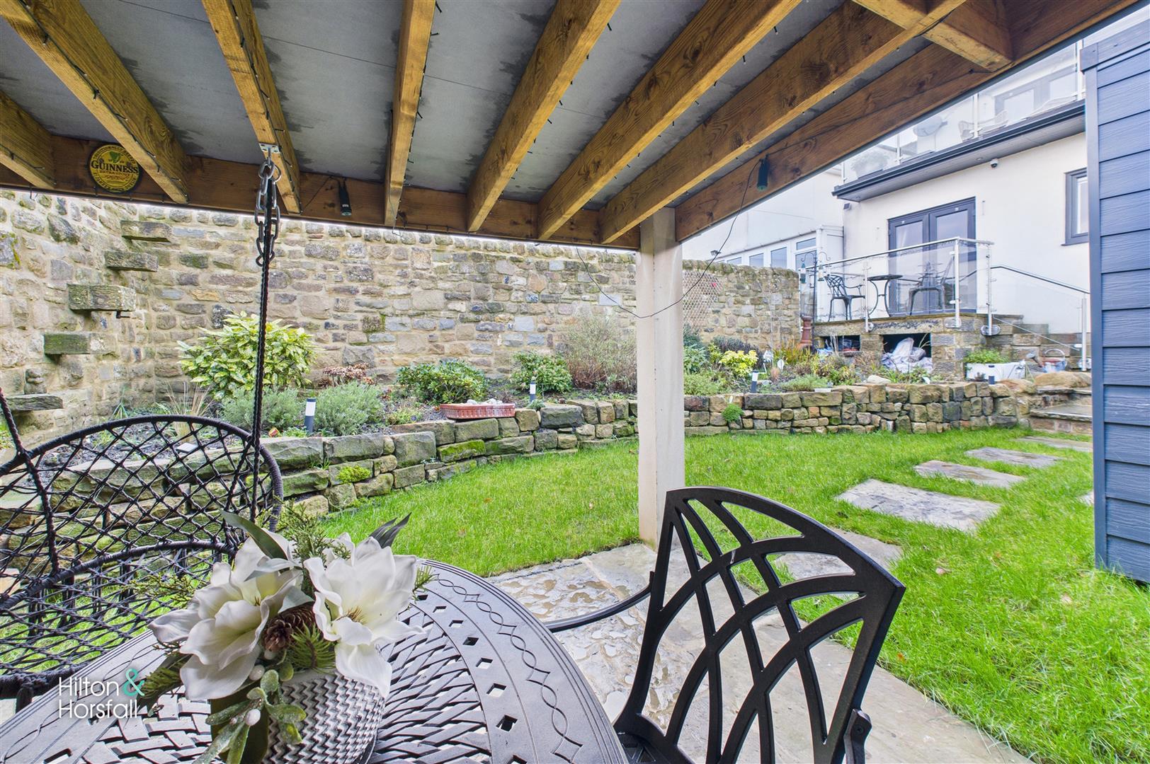 The south-facing rear garden enjoys an elevated and private setting, bordered by attractive stone walls and thoughtfully landscaped with lawned areas, established planting and stone pathways. A covered seating area creates a sheltered spot for year-round outdoor dining. Bedrooms two and three both open onto a superb first-floor balcony, offering a wonderful place to relax while taking in the far-reaching views across the surrounding countryside and rooftops, an ideal extension of the living space on warm days. A modern outbuilding provides additional storage.