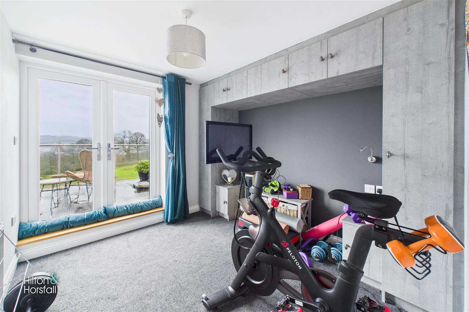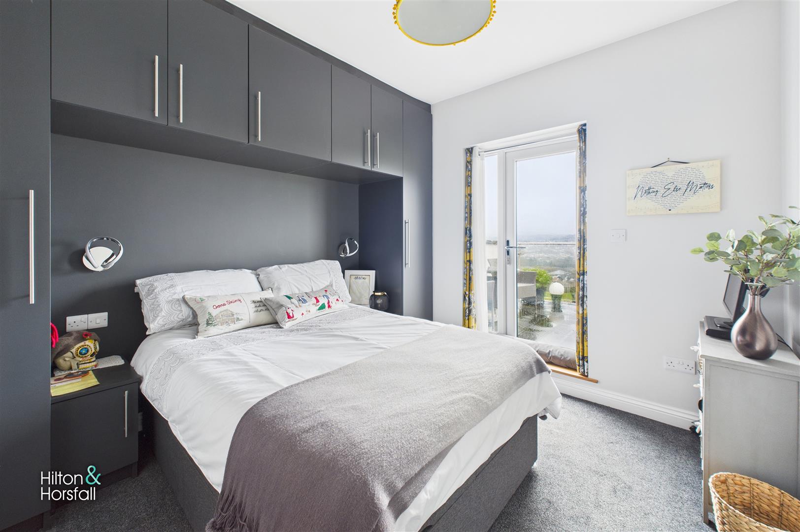 Situated to the rear of the property, this well-presented double bedroom features fitted wardrobes and cabinetry, along with French doors opening onto a private balcony that overlooks the south-facing garden. The elevated position provides wonderful far-reaching views, making this a peaceful and highly desirable space.