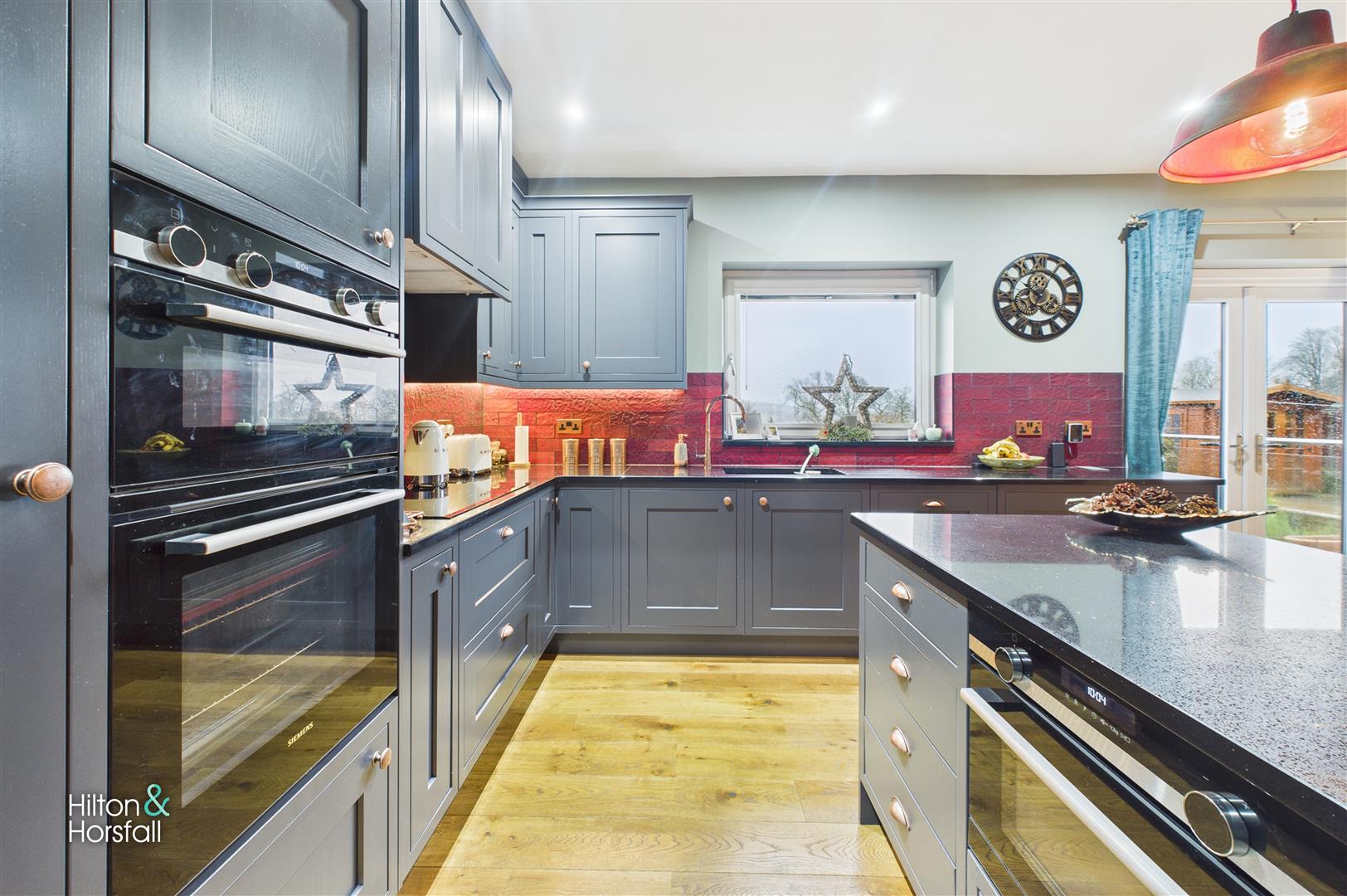 A practical and well-designed utility room provides additional worktop space, storage cupboards, and plumbing for laundry appliances. Finished with tiled splashbacks and a stainless-steel sink, this useful area helps keep the main kitchen clutter-free and is ideal for day-to-day household tasks.
