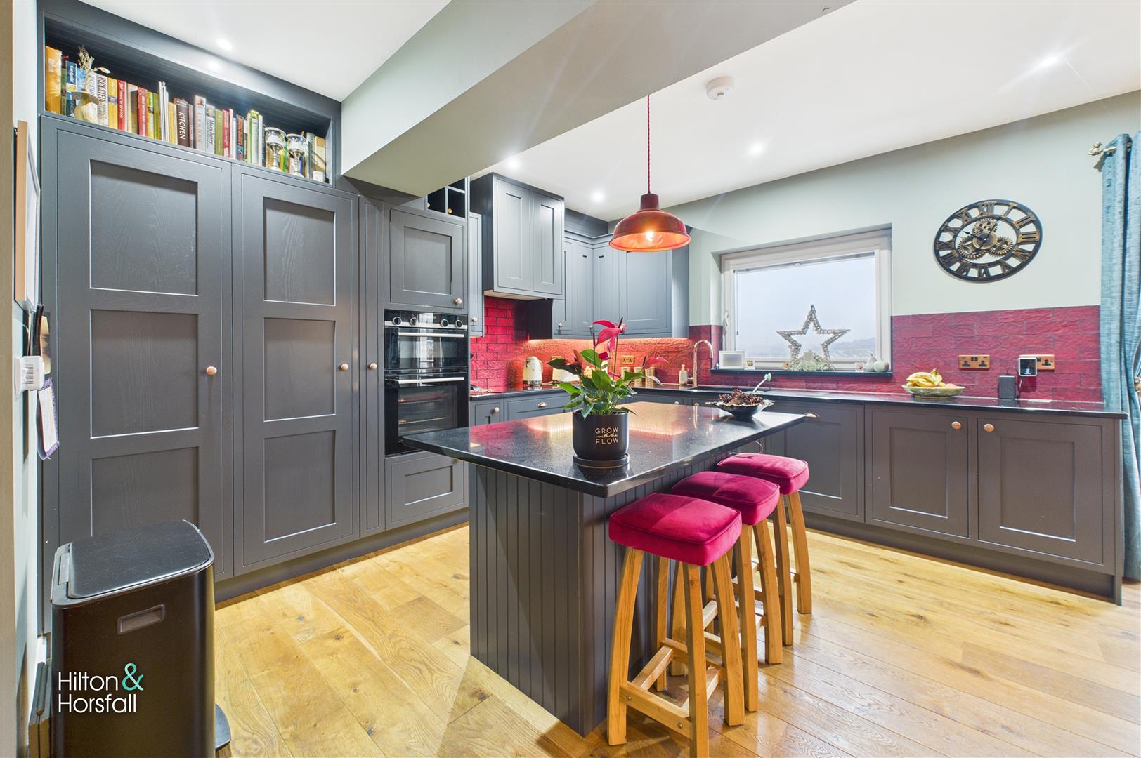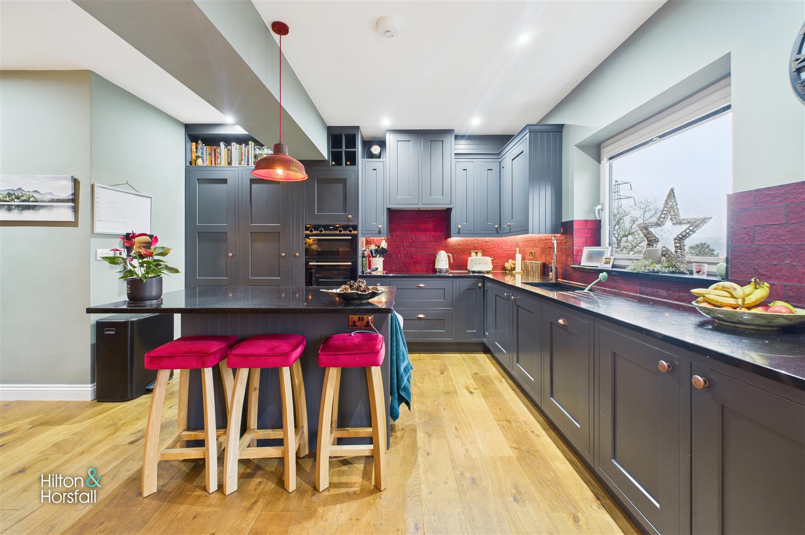 Beautifully refurbished and extended, this property offers a superb blend of modern open-plan living and characterful touches, all set within one of Barrowford’s most desirable locations. The spacious ground floor centres around an impressive full-width living, dining and breakfast kitchen area, finished with quality oak flooring, a cosy log-burning stove, bespoke bookcase and stylish shaker-style kitchen with granite work surfaces and central island. Practical additions include a useful utility room, ground floor WC and internal storage, while large windows and French doors ensure the home is filled with natural light. Upstairs, the property offers three well-proportioned bedrooms, including a generous main bedroom with bay window, fitted wardrobes and a contemporary en-suite. Bedrooms two and three both enjoy access onto a fantastic shared balcony with far-reaching views and the south-facing rear garden below. Outside, the garden is attractively landscaped with lawned areas, established borders, stone pathways, a covered seating area and a modern outbuilding. With driveway parking, a storage garage and a highly sought-after village setting, this is a beautifully finished home perfectly suited to modern family life.