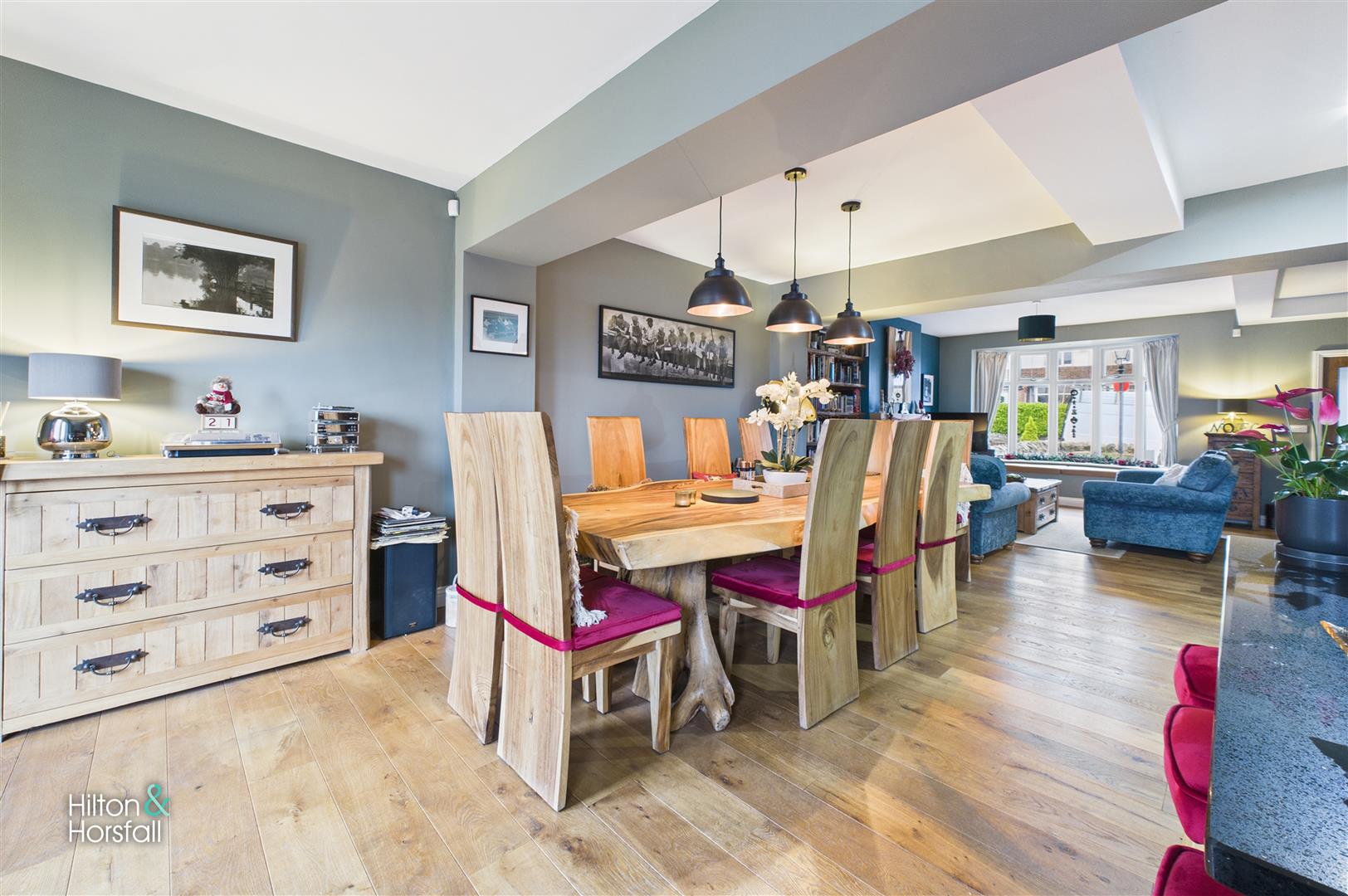 This impressive open-plan room forms the heart of the home, offering a beautifully balanced combination of style, warmth and practicality. The living area features a charming bay window, a log-burning stove set against exposed stonework, and a bespoke full-height bookcase that adds real character. Quality engineered oak flooring flows effortlessly into the spacious dining area and through to the contemporary breakfast kitchen, finished with shaker-style cabinetry, granite work surfaces, a central island with seating, and bold brick-style splashbacks. Flooded with natural light and opening out to the south-facing garden via French doors, this superb space is perfect for everyday family living as well as relaxed entertaining.