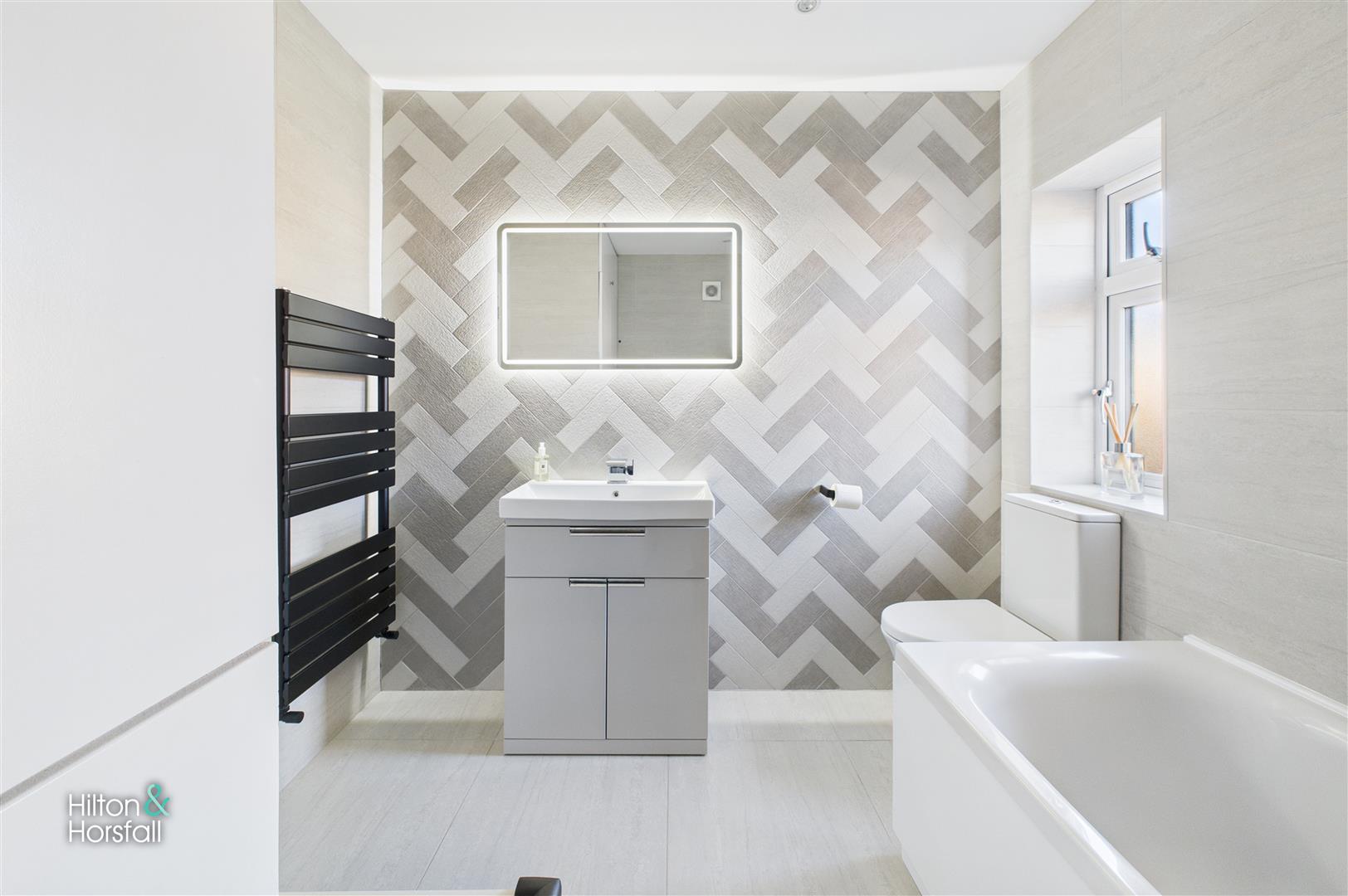 A contemporary family bathroom positioned to the front of the property, finished to an excellent standard and designed with both style and practicality in mind. The suite comprises a modern bath with glazed shower screen and rainfall shower, low-level WC and a sleek vanity wash hand basin, complemented by stylish tiling, an illuminated mirror and contemporary fittings throughout, creating a clean and elegant space.