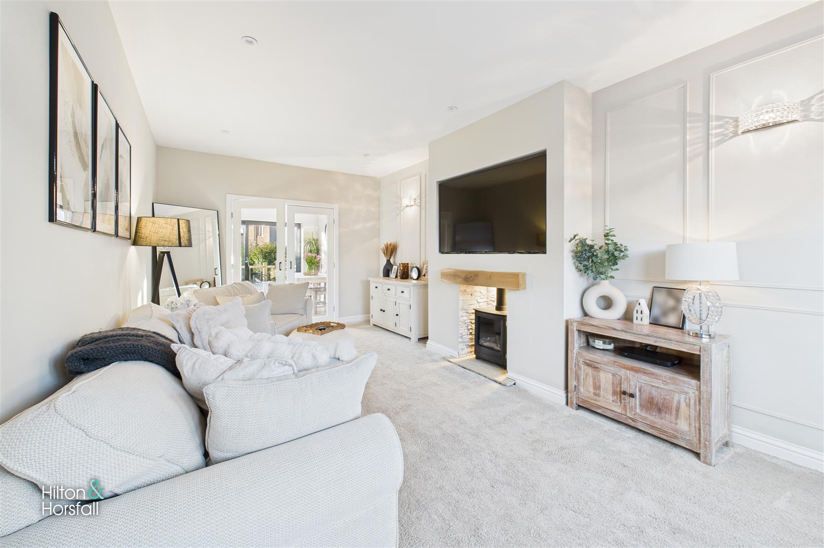 A beautifully presented and generously proportioned living room, finished in a calm neutral palette and flooded with natural light via the front bay window, creating a bright and welcoming space. The room centres around a stylish wood-effect gas stove set within a recessed fireplace with timber mantel and stone hearth, forming an attractive focal point, while plush carpeting, recessed ceiling spotlights and elegant wall panelling add to the refined finish. Offering ample space for a range of seating arrangements, this is an ideal room for both everyday family living and relaxing evenings, with double doors to the rear providing a seamless flow through to the open-plan kitchen and dining area.