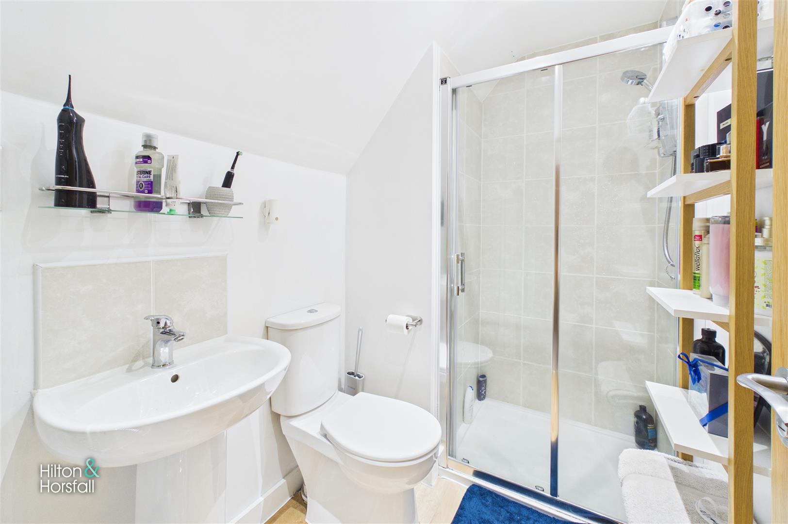 Fitted with a modern three-piece suite comprising a shower enclosure with glass sliding door, low-level WC, and pedestal wash basin. The space is part tiled and neatly presented, offering a practical and convenient addition to the principal bedroom.