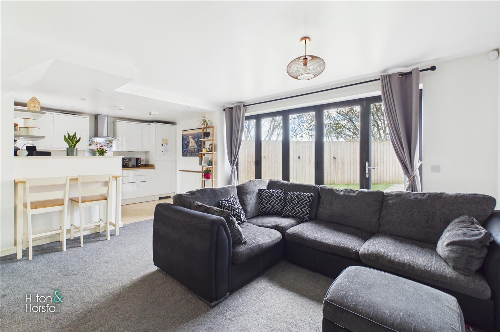 A superb open plan living space, ideal for modern day living, combining a stylish kitchen with a spacious lounge area. The kitchen is fitted with a range of contemporary wall and base units, complementary work surfaces, integrated oven, gas hob with extractor over, inset sink and space for appliances, all finished with sleek, clean lines. The living area is generous in size and beautifully presented, offering ample space for both relaxing and dining, with large bi-folding doors opening out onto the rear garden, allowing plenty of natural light to flood the space and creating a seamless indoor-outdoor feel.