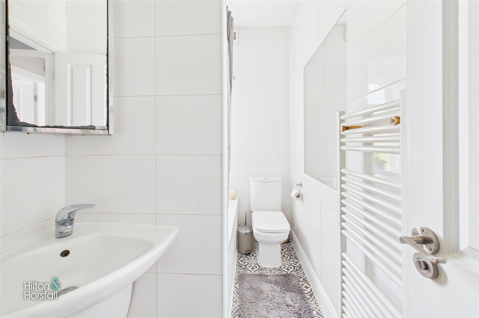A modern three-piece bathroom suite comprising a panelled bath with shower over, pedestal wash basin and low-level WC. The room is fully tiled for ease of maintenance and includes a heated towel rail and frosted window providing natural light and privacy. A clean, bright and practical space ideal for everyday family use.