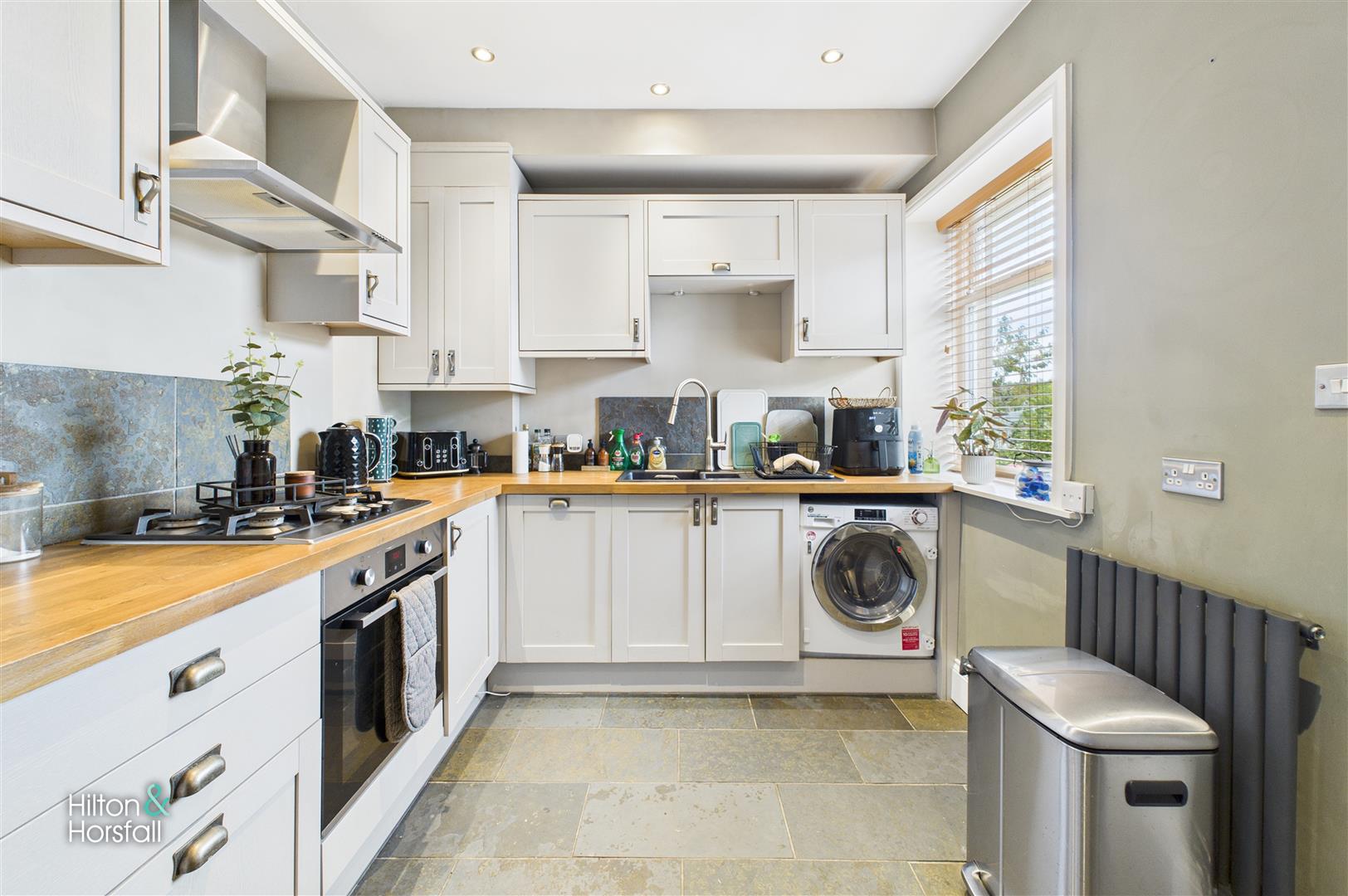 A stylish and well-appointed kitchen fitted with a range of contemporary shaker-style wall, base and drawer units complemented by solid wood work surfaces. The space is finished with a tiled splashback and practical tiled flooring. There is an integrated electric oven with gas hob and extractor canopy, plumbing for a washing machine, and ample room for additional appliances. A window to the rear aspect allows for plenty of natural light, and a door provides access to the outside. Stairs rise from here to the first floor.