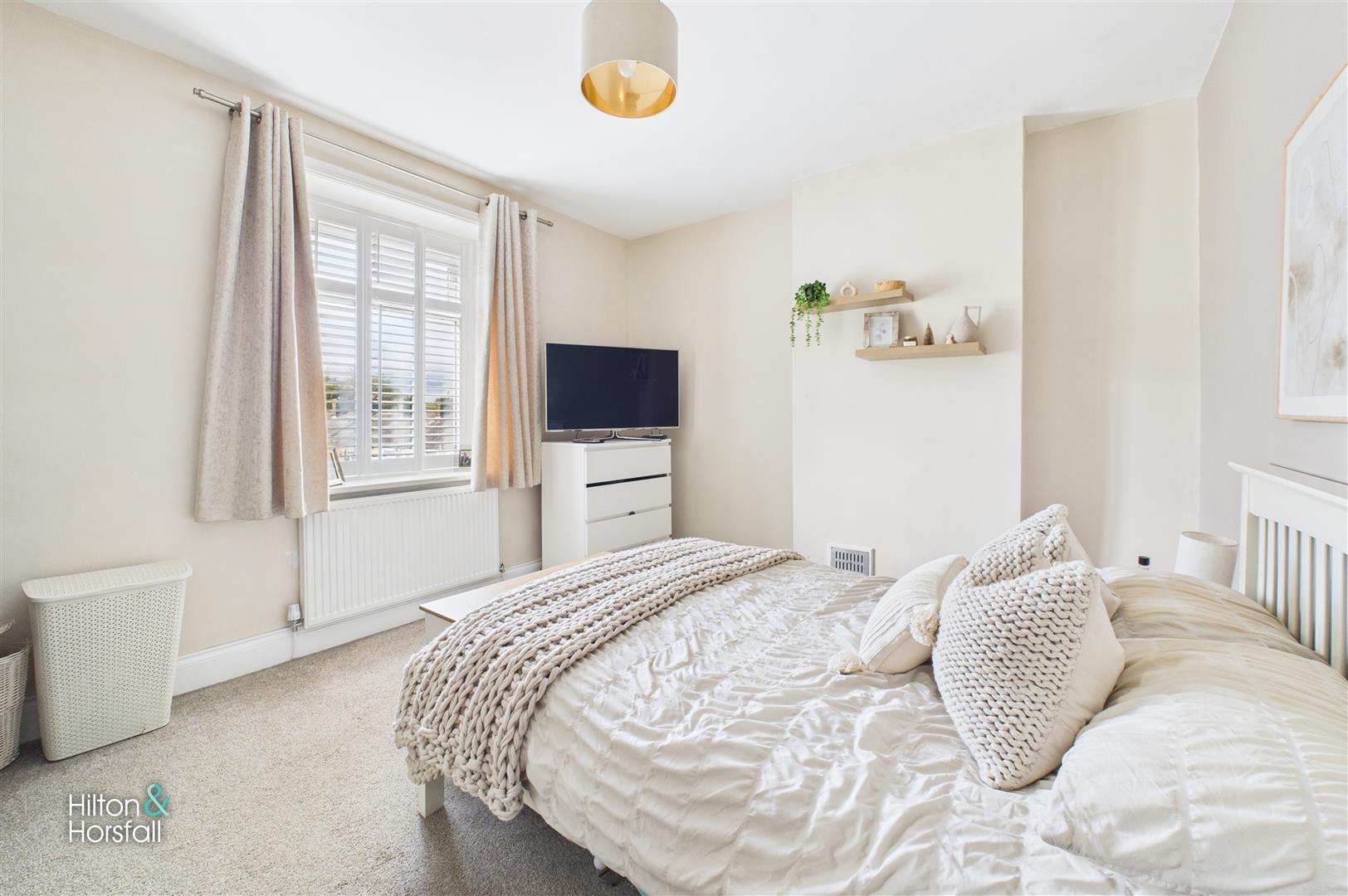 A generous double bedroom positioned to the front of the property, offering plenty of natural light through a large window fitted with plantation shutters. The room is tastefully decorated in neutral tones and provides ample space for bedroom furniture. A bright, calming space ideal for rest and relaxation.