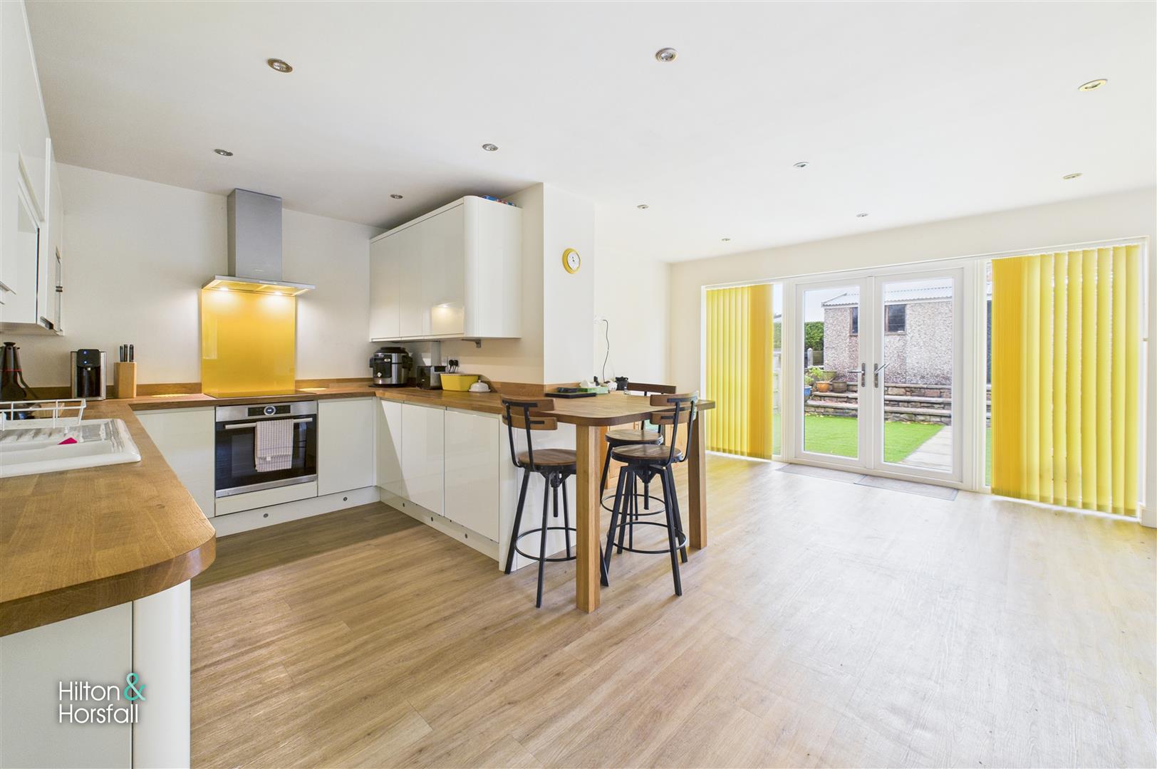 A spacious and contemporary open-plan kitchen fitted with a range of high-gloss units, complementary wood-effect work surfaces, and quality integrated appliances, offering both style and practicality. The generous layout includes a breakfast bar for casual dining, as well as ample space for cooking, storage, and everyday family life. Open through to the dining area, the space is ideal for entertaining and socialising, with plenty of room for a dining table and direct access to the rear garden — creating a seamless indoor-outdoor flow perfect for modern living.