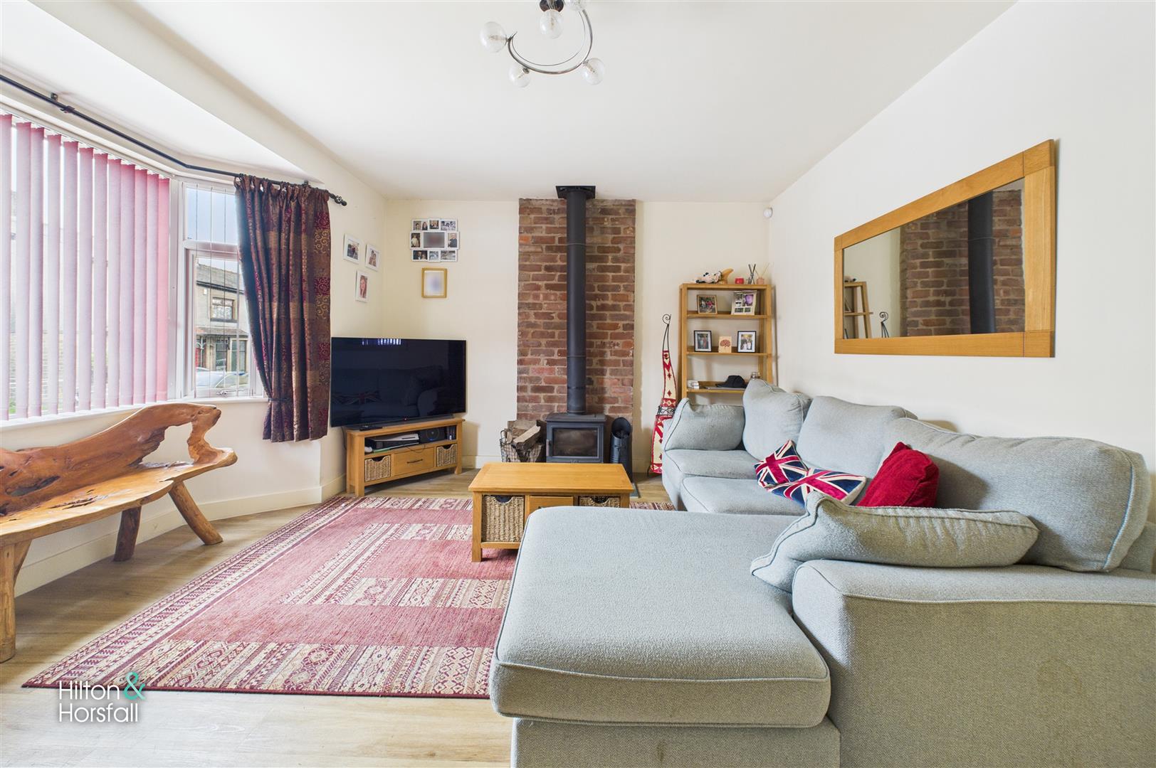 A warm and welcoming main reception room featuring a charming exposed brick chimney breast with a wood-burning stove as its focal point — perfect for cosy evenings. A large bay window allows plenty of natural light to flood the space, creating a bright and inviting atmosphere, while the open-plan feel and neutral décor offer excellent versatility for a range of furnishings and layouts. This is a superb space for both relaxing and entertaining.